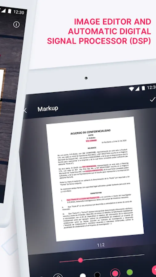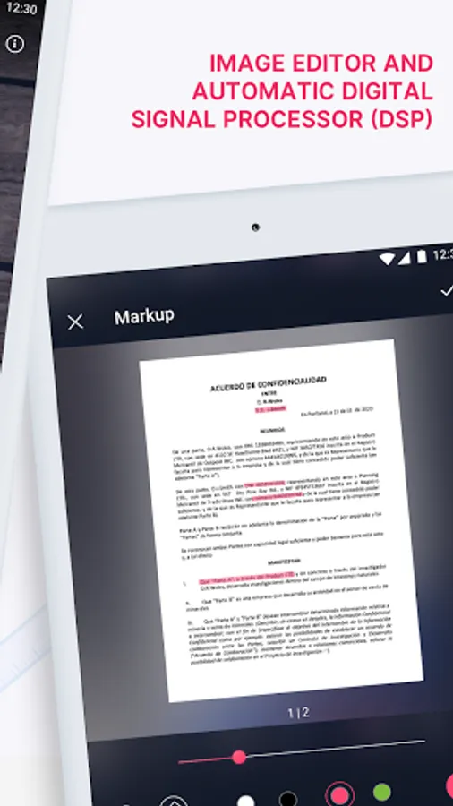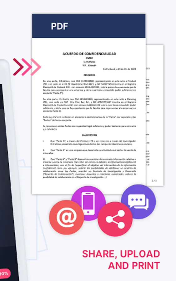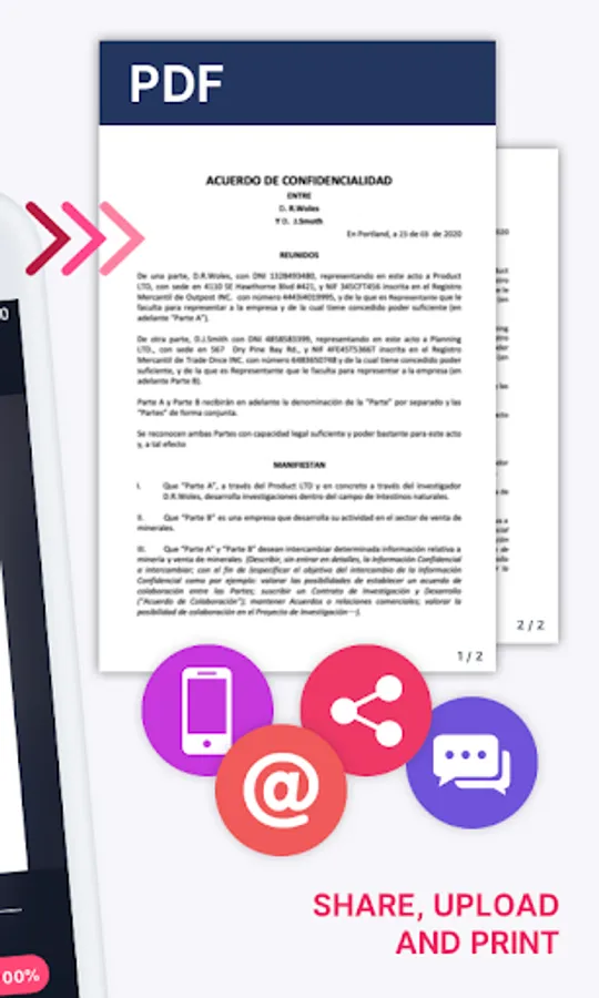 Save your multi-pages scanned documents as JPEG, PNG, TXT files and share to any other application that supports the above mentioned file formats (Word, Excel, Access, Power Point, Photoshop), send documents via E-mail, print them in one single tap, and much more!