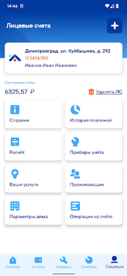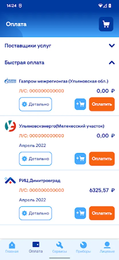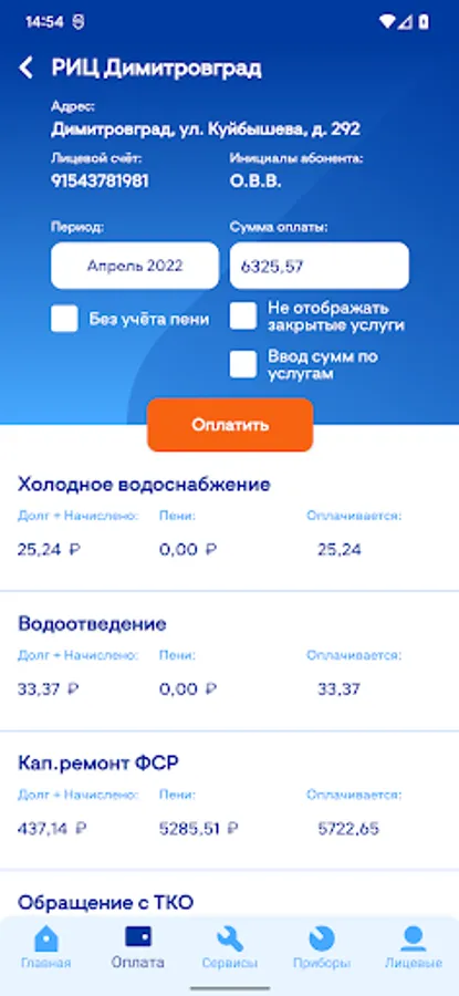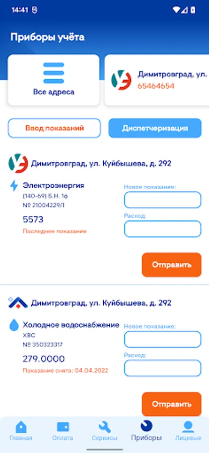 - View used metering devices, enter their readings, view the history of readings