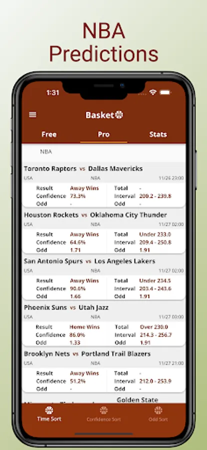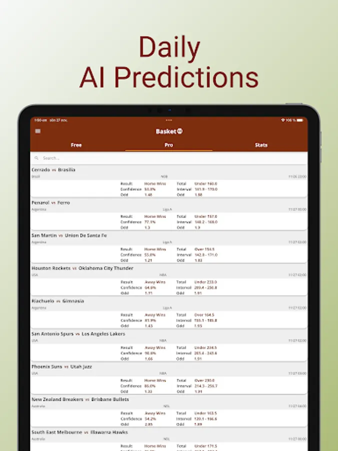 Our AI algorithms generate the likelihood of each basketball team to win the game that will be played. These predictions are probabilistic and shared as a percentage figure for each team. Since there is always a winner in basketball games, the team having a winning probability that is greater than 50% is the expected winner based on our algorithms. Our algorithms expect that a given game is riskier for betting when these probabilities are close to each other (say 48% and 52%). As the winning probability increases and gets closer to 100% for a given team, it indicates a stronger confidence on the prediction for that team to win the game. Whenever it is possible, reference odds are made available as well from bookmakers for each game result prediction.