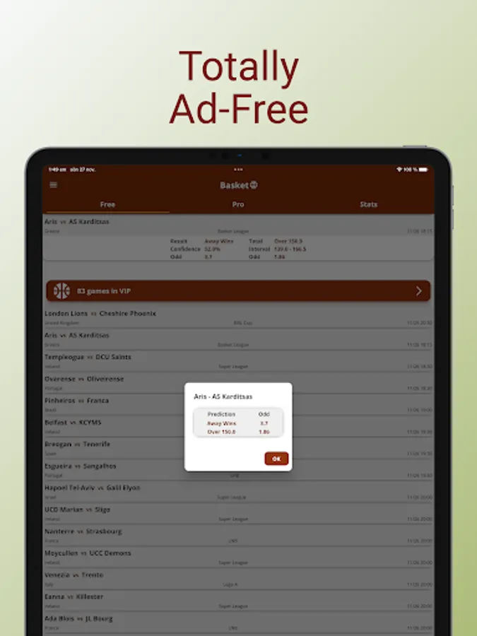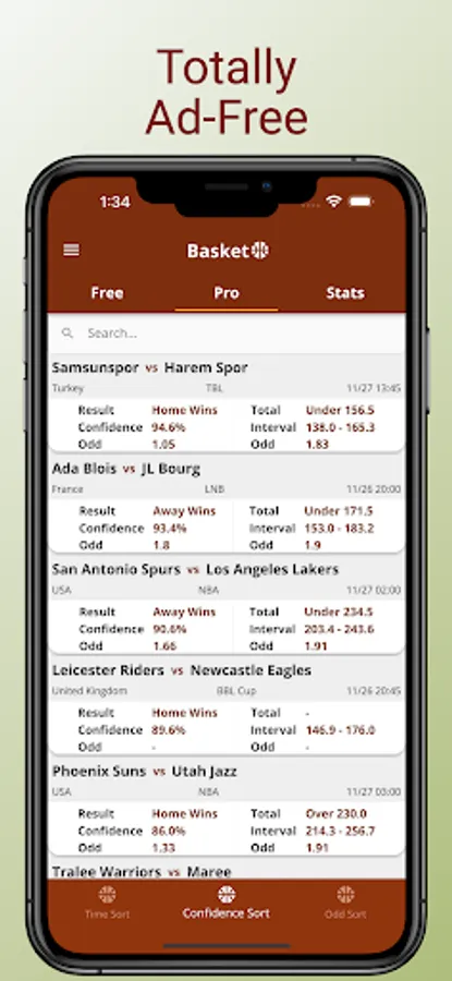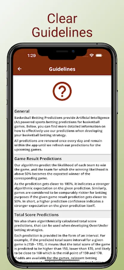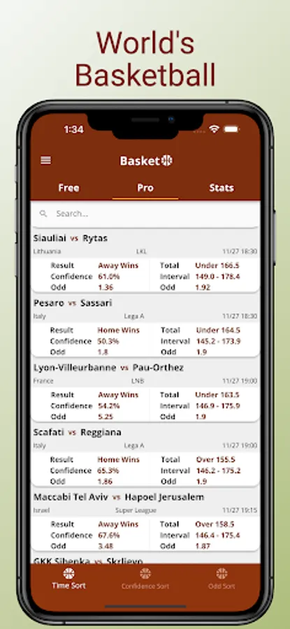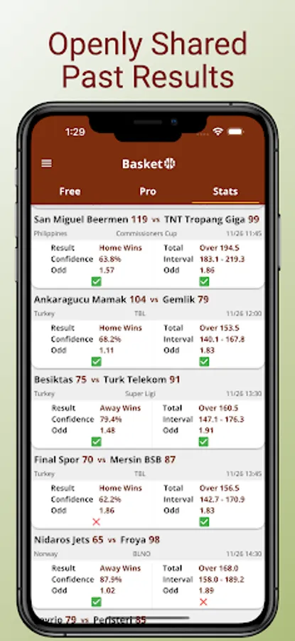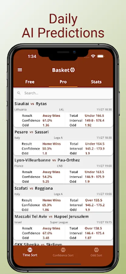 Beside game result predictions, we even share total score predictions for each game. It is very challenging to be very accurate on total score predictions so that beside the total score prediction, we even share a prediction interval for the total score itself. For example, if the total score prediction is – say – 180 for a given basketball game, our algorithms also provide an interval i.e. the total score of the game is expected to be between 168 and 192. In this way, you can try to pick the best bet for total score betting for basketball games. Whenever it is possible, reference betting odds are made available for total score predictions as well in our mobile app.