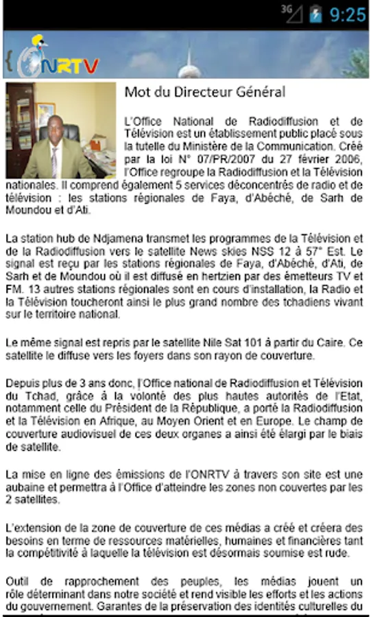 Public service media created in December 1987 in exceptional circumstances, the TV Chad is one of two directions- the other being the direction of the Radio Chad up the National Office of Radio and Television of Chad (ONRTV). The National Television has five (5) sub-departments namely: