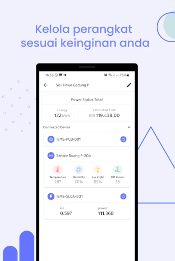IEMS is an application for managing and monitoring electrical resources owned by users for the context of residential areas, where users must have devices for monitoring, control and others related to electricity.