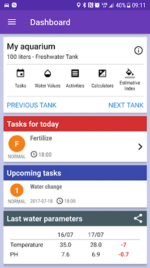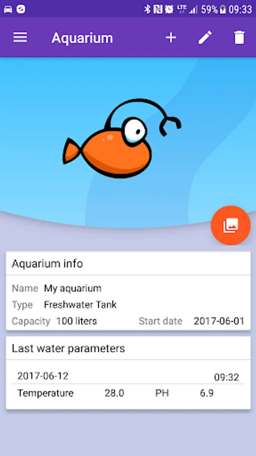 Allows you to view, create new and edit your aquarium data. In addition to basic data such as name and capacity of the aquarium, you will see the latest water parameters added to this tank.