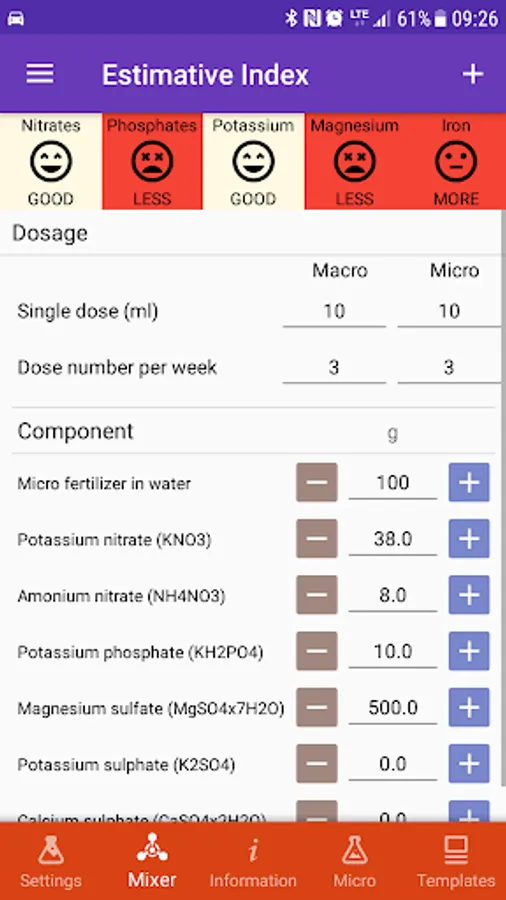 Calculator for fertilization by Estimative Index. All settings and parameters for both Macro and Micro fertilizers can be saved to the template for later refinement.