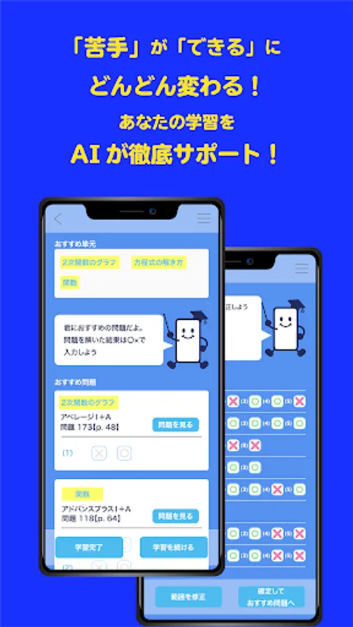 AI analyzes the results of the problem collection you have worked on, and recommends returning to the unit where you have learned the problem that suits you.