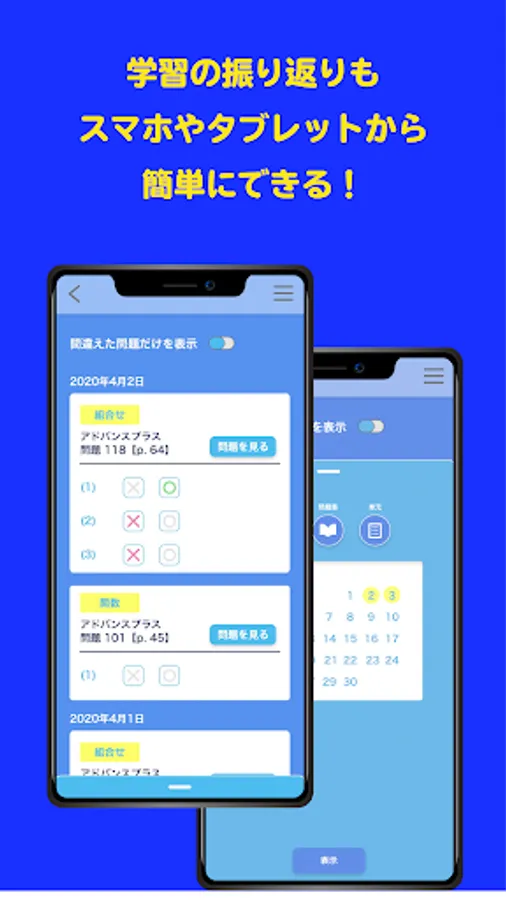 You can check the problems you have learned so far and the results from your smartphone or tablet. Even if you don't have a paper question book at hand, you can manage your learning at any time.