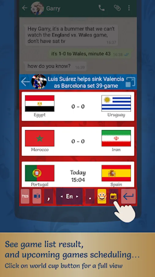 Real-time scores and live updates appear directly on your keyboard, so you can stay up to date without switching between apps, World Cup news and updates will scroll if the keyboard is not in use. This functionality, along with ai.type’s innovative word prediction and completion means you may be the first to send a celebratory message when your team scores a goal.