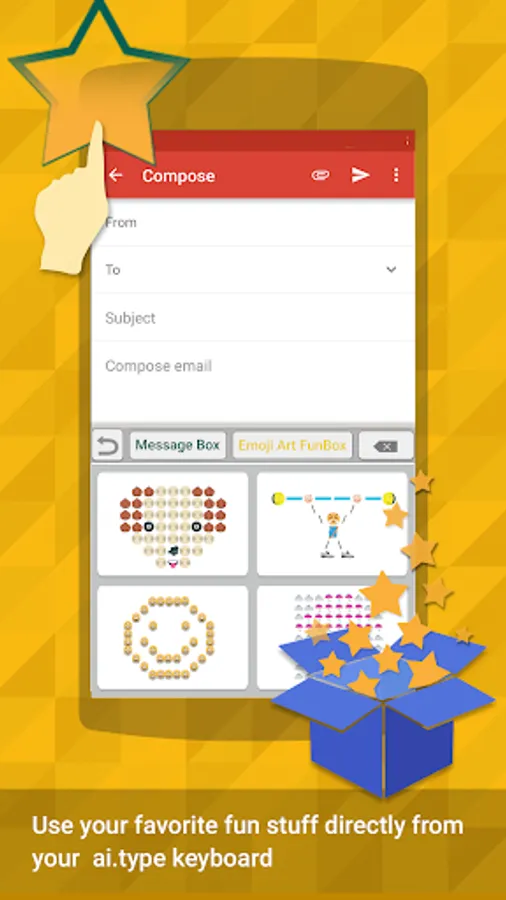 Be the coolest and most up-to-date typist. Use thousands of ready-made emoji drawings to match your message, from our Emoji Art Fun Box!