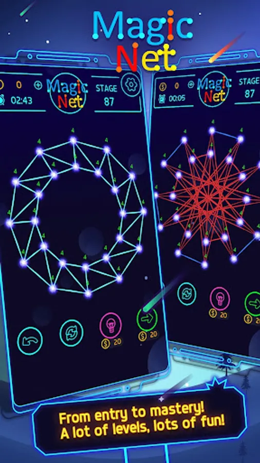Magic Net is a very interesting decryption puzzle game, players need to unravel the complex interlaced magic network connection, forming a line that does not cross each other. In the game, hundreds of different styles of crossover nets are designed to wait for the player to unlock step by step. In fact, it is not difficult to quickly clear the Magic Net. As long as we follow the principle of the shortest line between the two points, the complicated connection will be Disassemble into triangles to easily accomplish the achievement of all line segments not intersecting. This game sets hundreds of levels for you to challenge, from simple to complex, step by step to challenge the imagination of the space, when you unravel the complex lines and turn them into beautiful graphics, you will have an unparalleled sense of accomplishment. And quickly download the fun of enjoying the game with your friends.