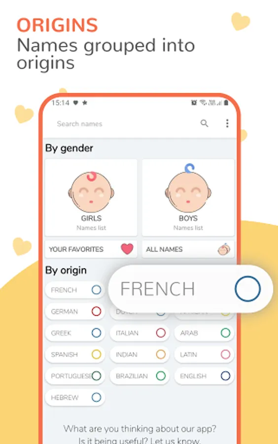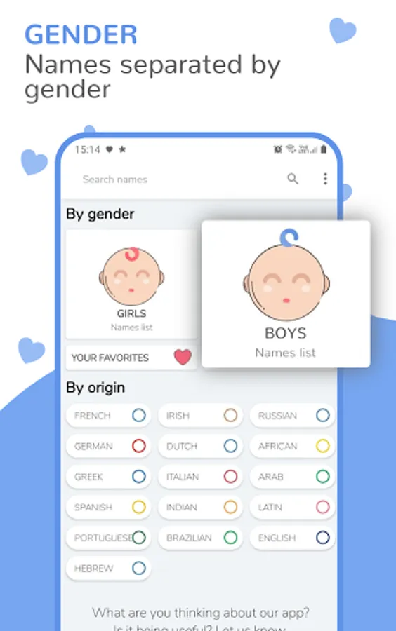 - Allows you to filter by name, by origin and by gender (girls or boys);