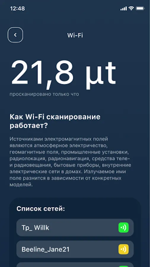 Your smartphone is equipped with an internal antenna so it can pick up Wi-Fi networks. Even without using special applications, you can see how close they are (weak / strong signal). The application will allow you to add up all the radiation indicators affecting a specific point where the smartphone is located, so that you can assess the risks.