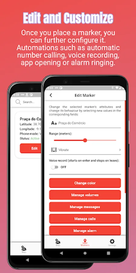 Once you enter or leave any of these markers, the phone will automatically do what you specified. Examples of what you can specify are phone volumes, SMS message sending to one or multiple contacts (Currently limited due to Android's permission rules - can only be sent with user input), voice recording, screen brightness, flashlight, phone number calling, alarm ringing (there is a secret in the alarm screen, try to figure it out!) or app/website opening.