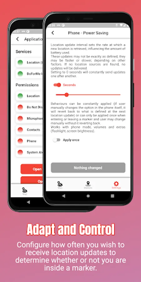 Location updates are sent in order to detect whether you entered or left a marker. You can customize how often you wish these updates to be retrieved - choose from 0-60 seconds or 2-30 minutes and adapt it to your needs, saving a large amount of battery.