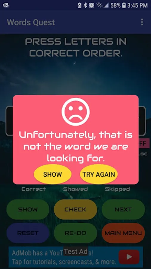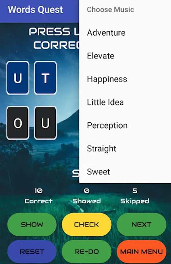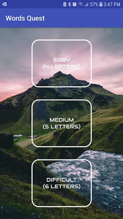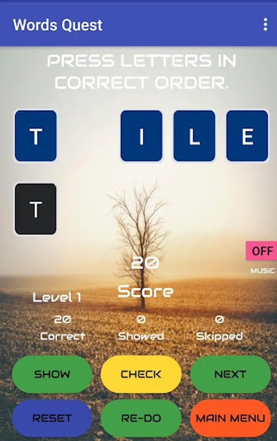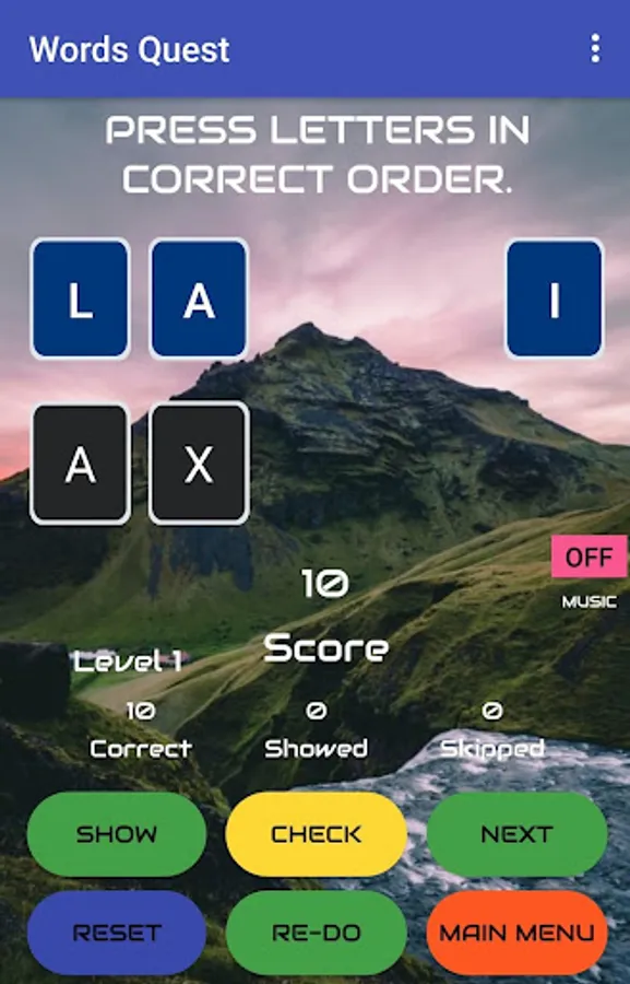 It has three levels, easy (4 letters), medium (5 letters) and difficult (6 letters). Choose your level and start playing. You get indefinite tries if you are not able to reveal the word. But if you are not able to guess, you have option to skip or show the word. But you loose points by doing so.