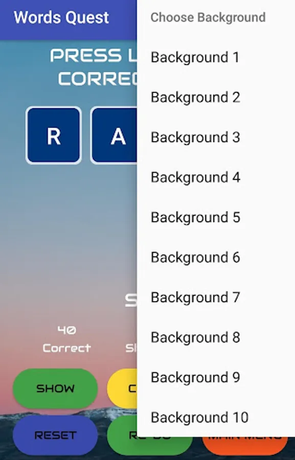 Your score remains saved on the device with an option to reset to zero any time. You get 5 or 10 points for each word making. You loose 10 points to show the word and 5 points to skip the word. Word is randomly picked from the database and randomly scrambled. There is no time limit to guess the word.