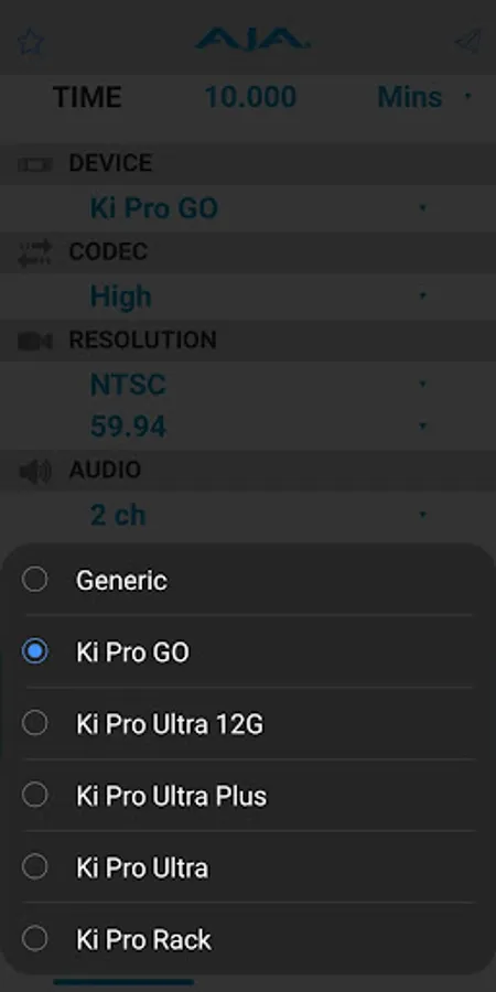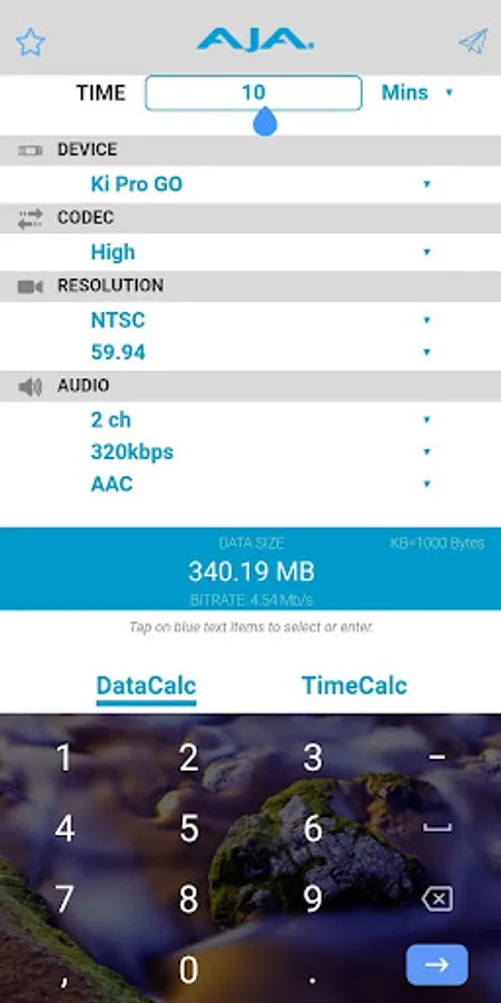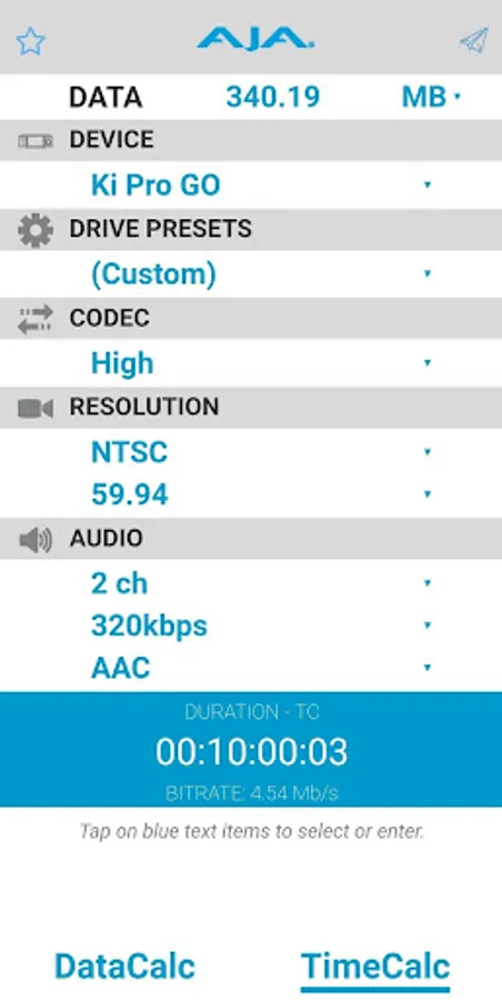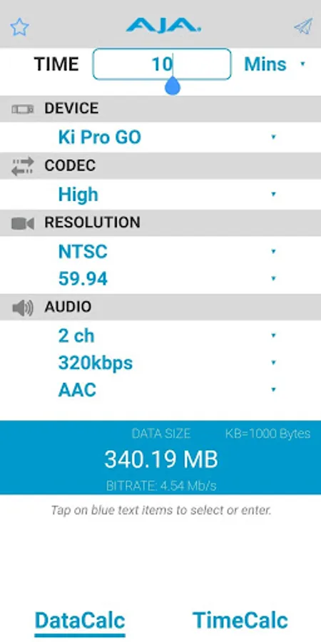 The AJA DataCalc computes storage requirements for professional video and audio media.
