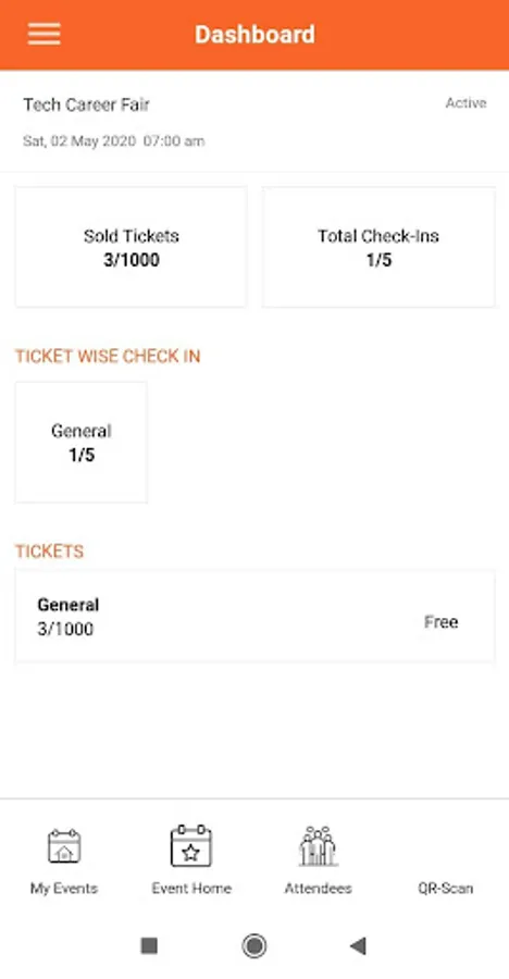 • Dashboard screen shows the total attendees, total sold tickets, total check-ins, etc. for particular event in