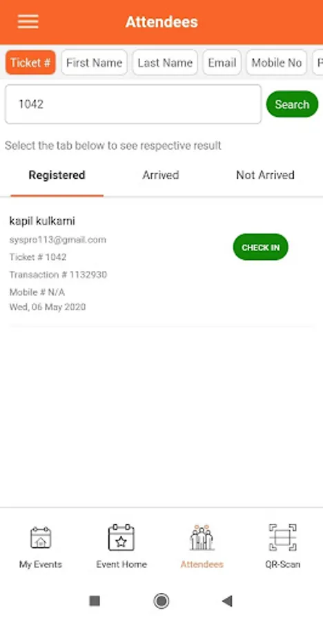 • Attendees screen has attendee search functionality where user can search by different available tags and search result is displayed under particular tabs..