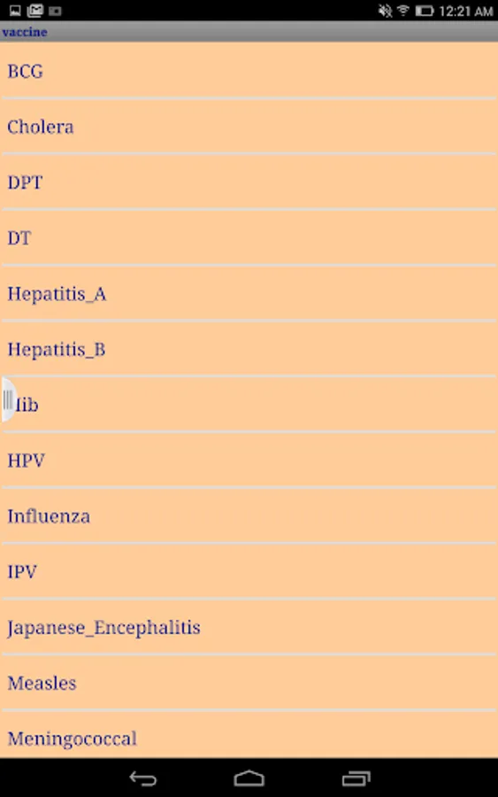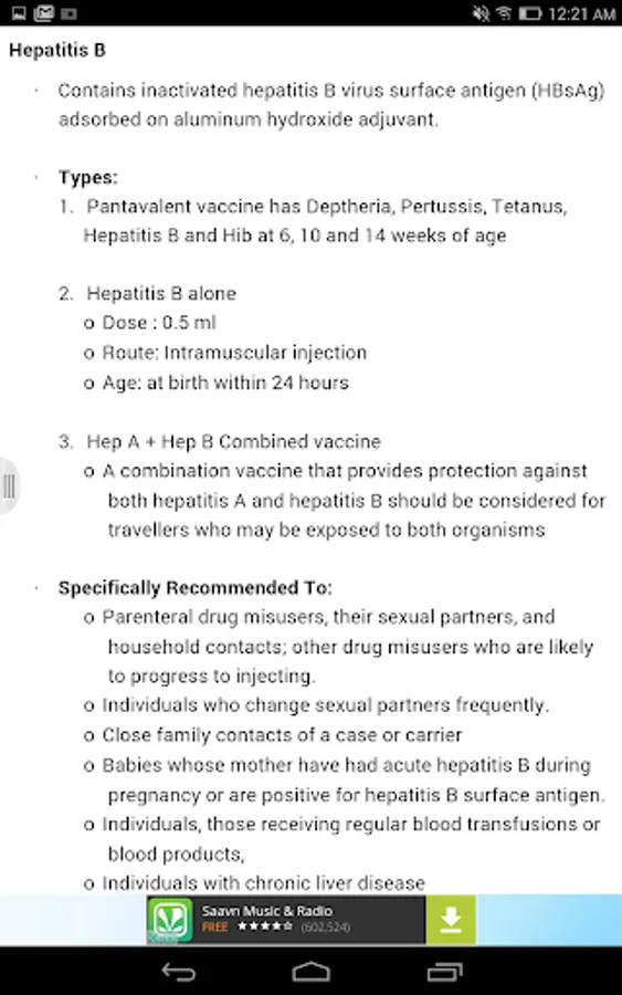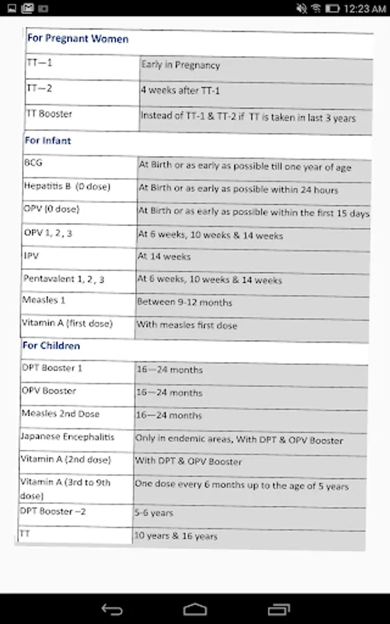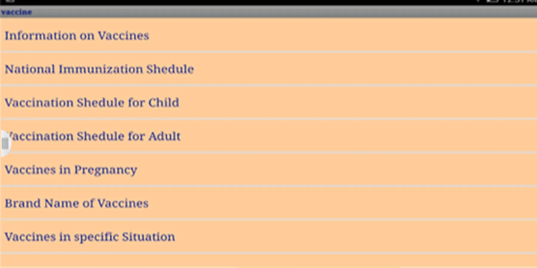 This application provides information about various vaccines available in India as well as route and dose for different age. It also covers child and adult immunization schedule.