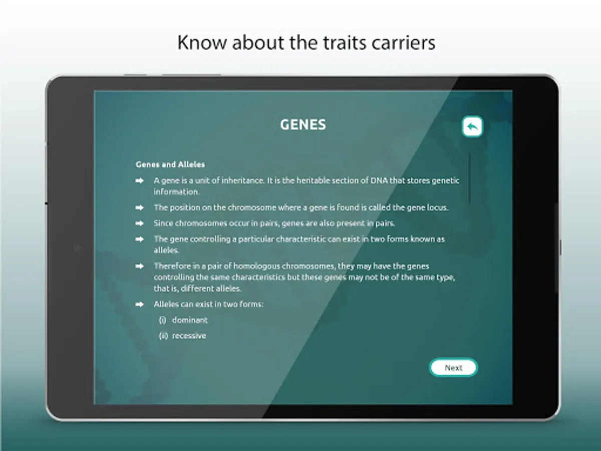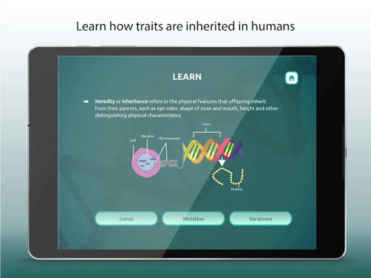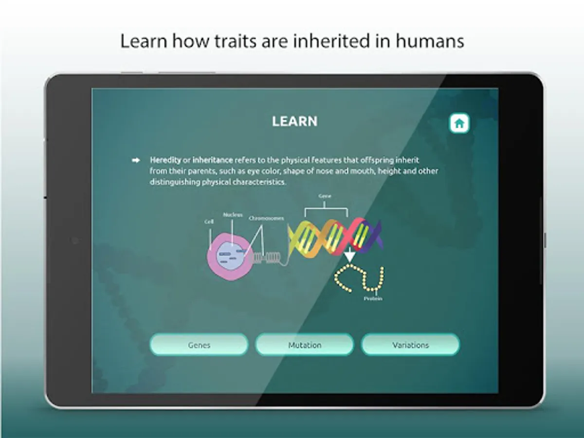 This educational application helps students understand and learn about epigenetics, Inheritance Biology, genetic model, human genome, genetics and heredity in an easy and engrossing way.