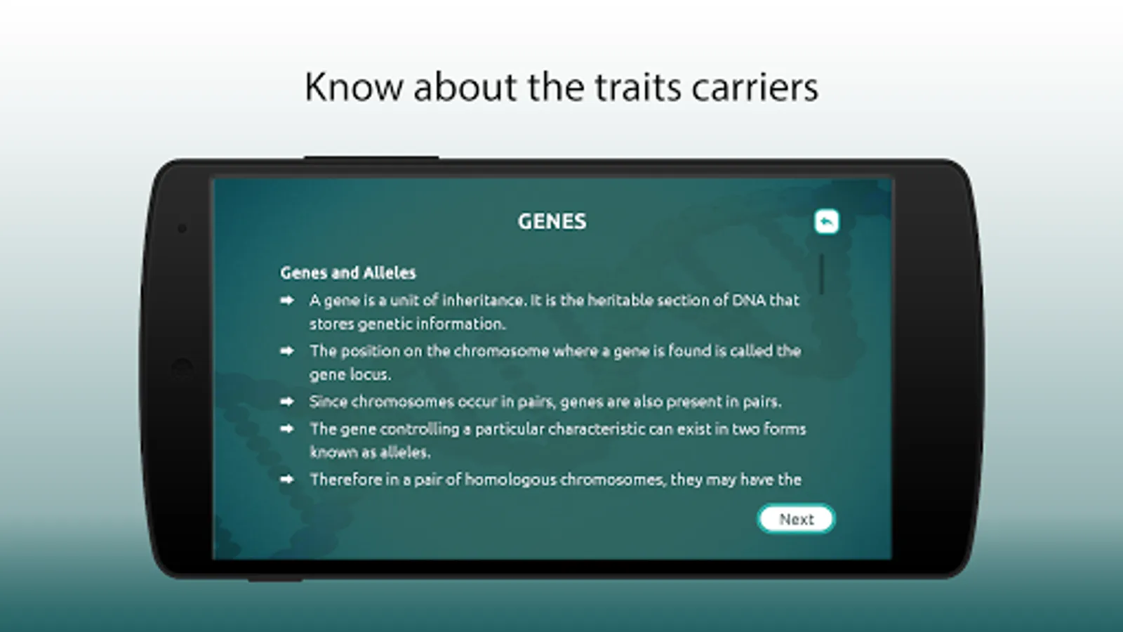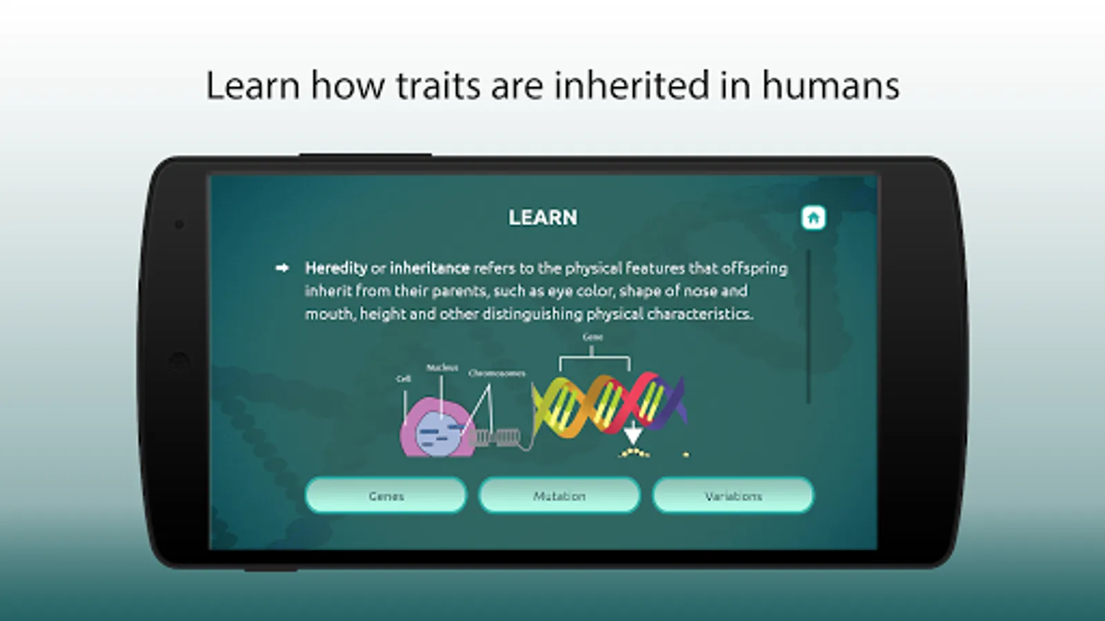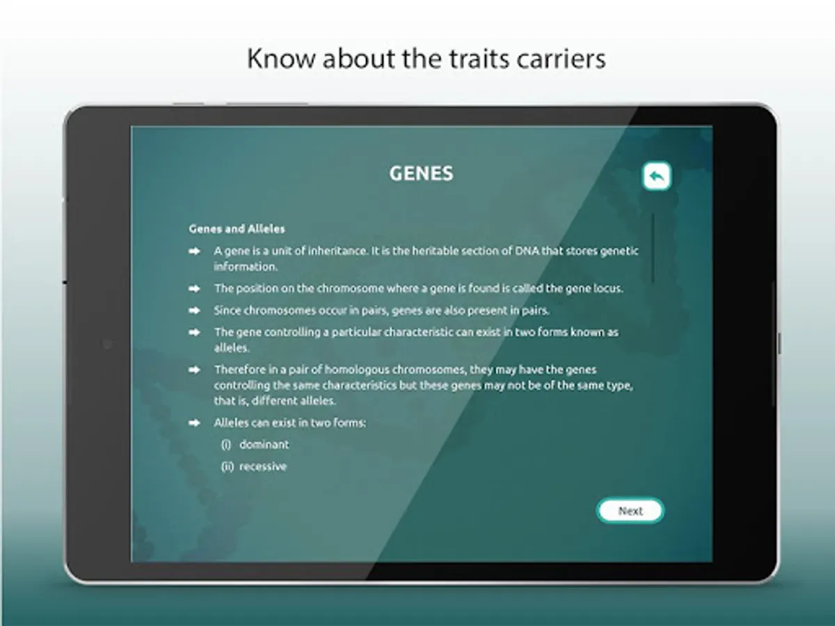 This educational application helps students understand and learn about epigenetics, Inheritance Biology, genetic model, human genome, genetics and heredity in an easy and engrossing way.