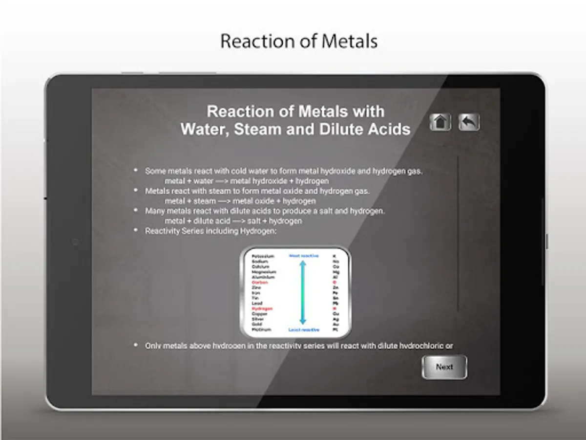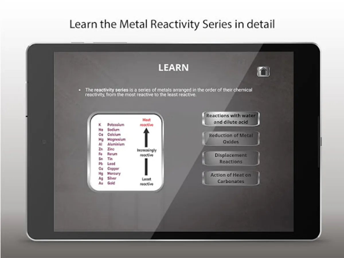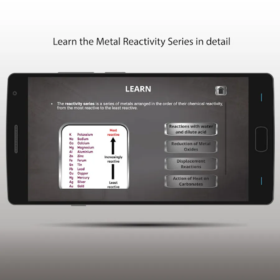This educational application helps students understand and learn the reactivity series of metals, most reactive metals, metal reactivity series, chemistry activity series in an easy and engrossing way.