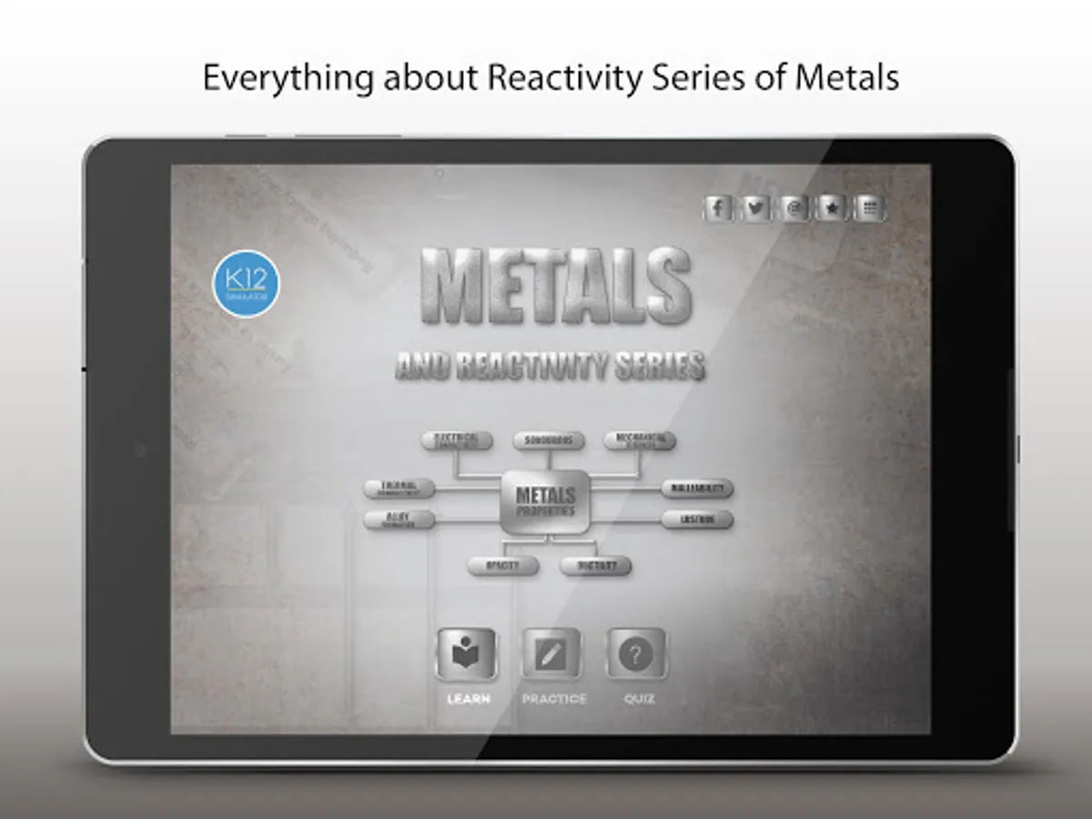 “Reactivity Series of Metals” is an interactive app for students to learn about the reactivity series of metals, most reactive metals, metal reactivity series, chemistry activity series in an easy and engrossing way by visualizing the 3D simulations and videos. It is one of the best educational applications which is designed to help students learn the list of reactivity series of metals, most reactive metals, metal reactivity series, chemistry activity series in an innovative learning method. This app is for students in the age group of 11 - 15 years and is optimized for use in tablets of both android and iOS versions. “Reactivity Series of Metals” app is students friendly and easy to use. Download the app NOW and assist your children to learn the reactivity series of metals, most reactive metals, metal reactivity series, chemistry activity series easily.