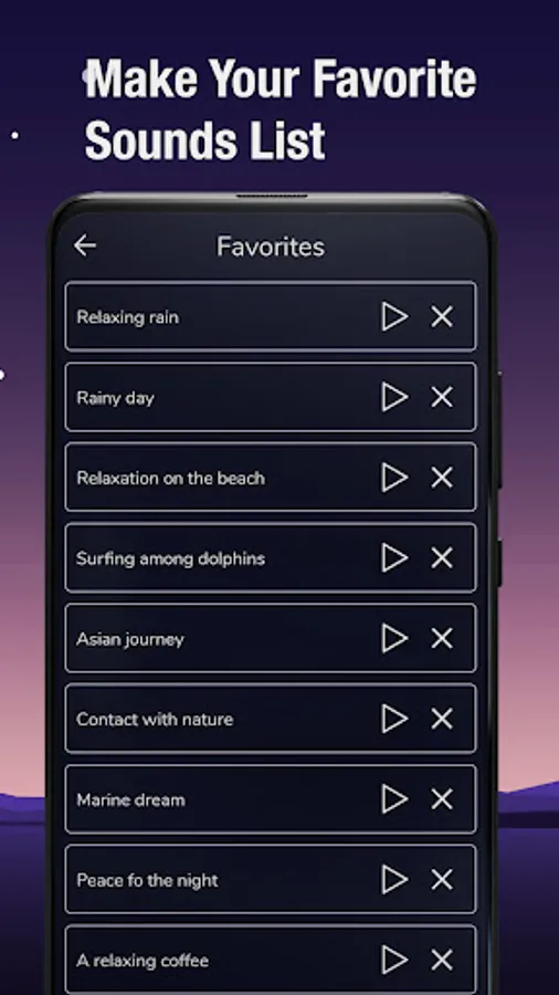 ‘Meditation & Relaxing Music’ provides users with essential function – making lists with the most favorite sounds. Add to the list music of nature like rain, fire, ocean, forest and wind. Each sound might be chosen for having a rest or relaxation. Our collection of meditation music is always growing. There can be found sounds like: Amazonian jungle, bonfire near tents, ocean waves, rustling of trees and etc.