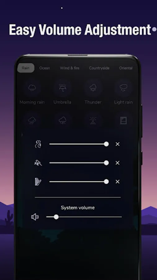 Relaxing music could be controlled separately as well as in system. Each sound has its own volume in order to adjust it. This function gives an opportunity to create your own unique melody. They could be saved in the library and be listed at any time.