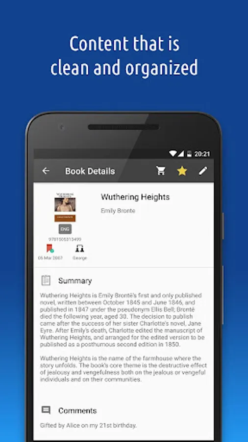 We understand how much time you take to get your bookshelf organized. We have tried to apply the same meticulousness in how a book’s details are displayed - organized and clean. For books that have been looked up from Amazon, find the shop icon in the action bar of the book details page.