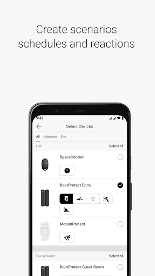 Automation scenarios make your security system go beyond detecting threats and begin to resist them actively. Configure the Night mode security schedule or turn off the lights automatically when you arm the space. Program your outdoor lights to spot the trespassers when they set foot on your property, or configure a flood prevention system.