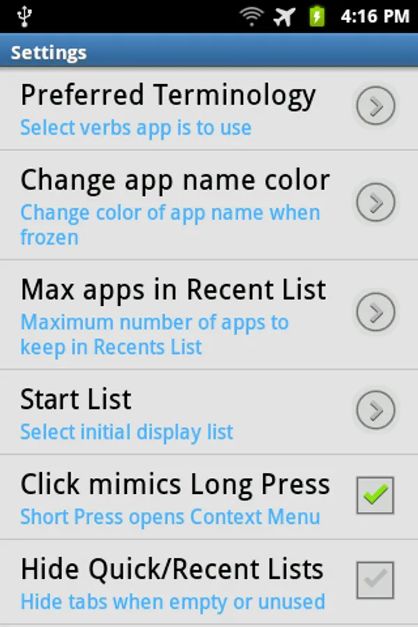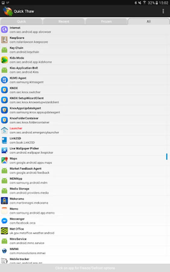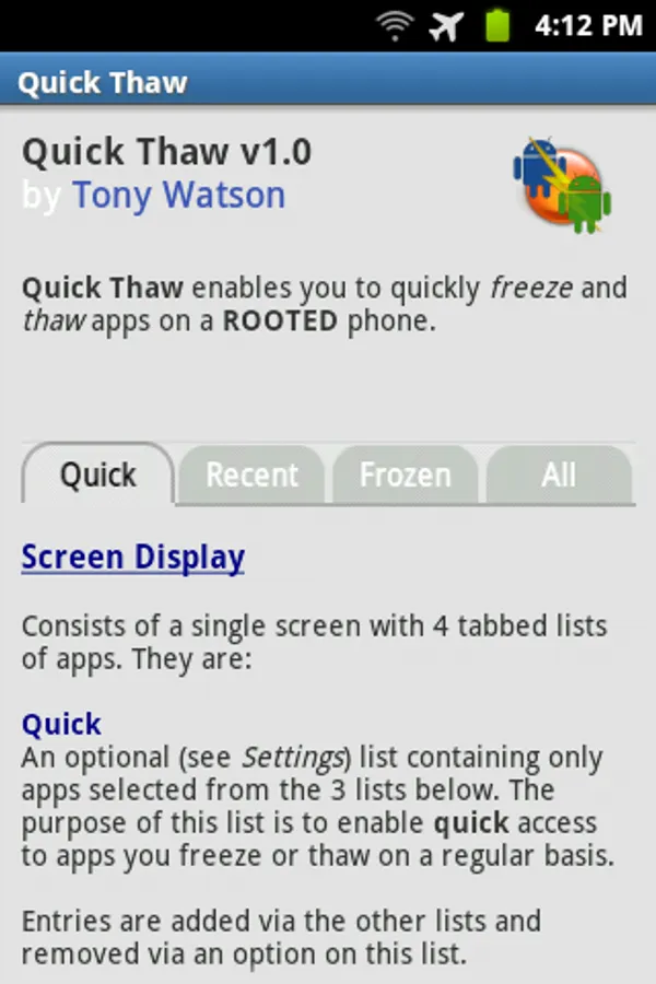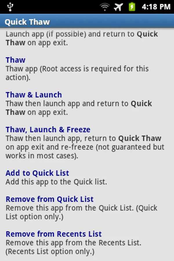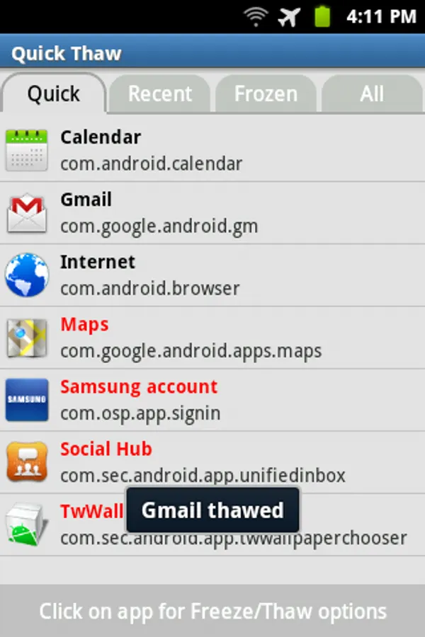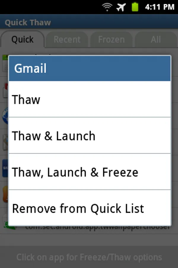 You choose which list appears at Quick Thaw start up to enable you to quickly thaw and launch a frozen app.