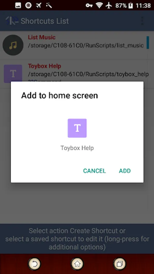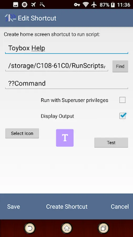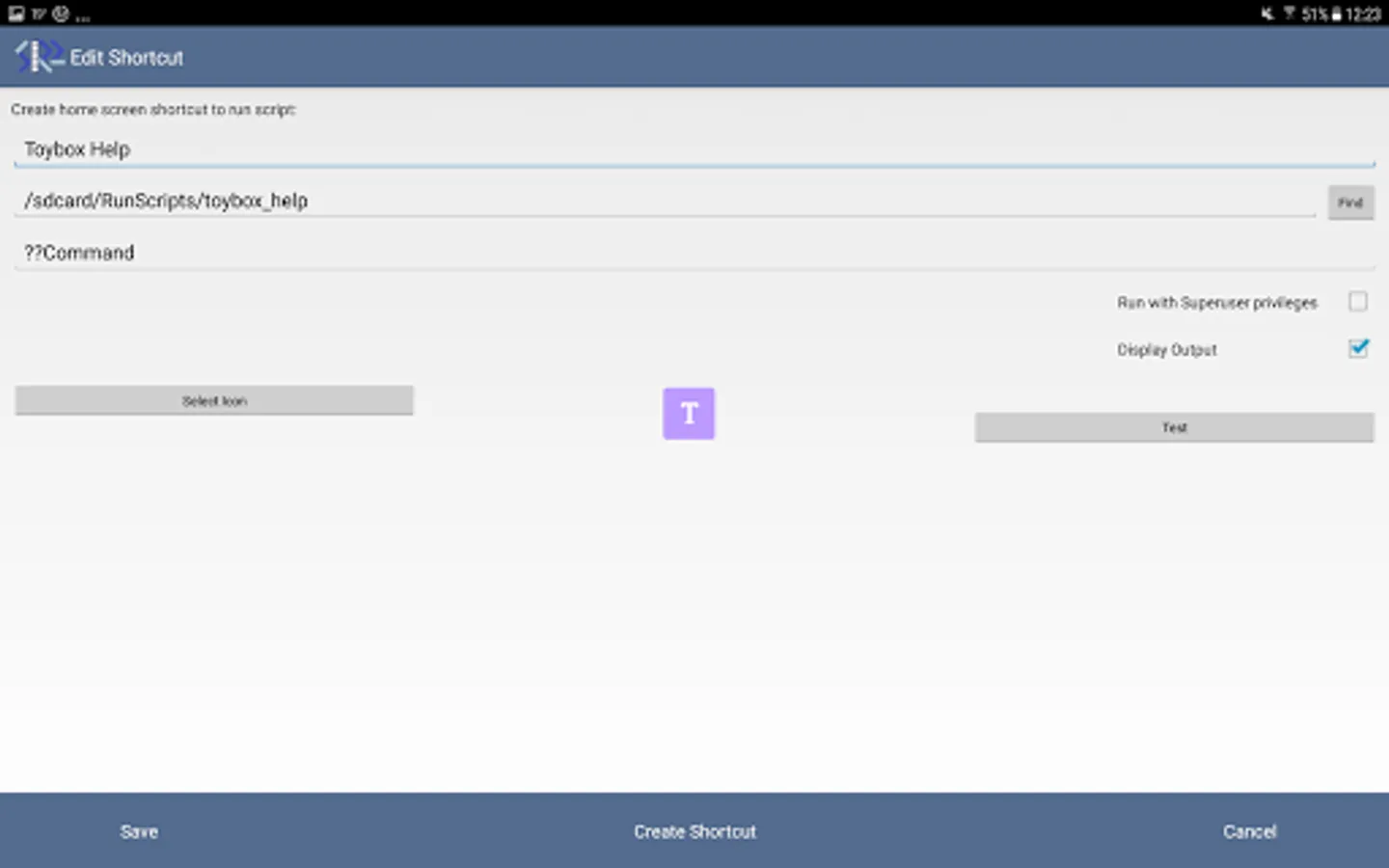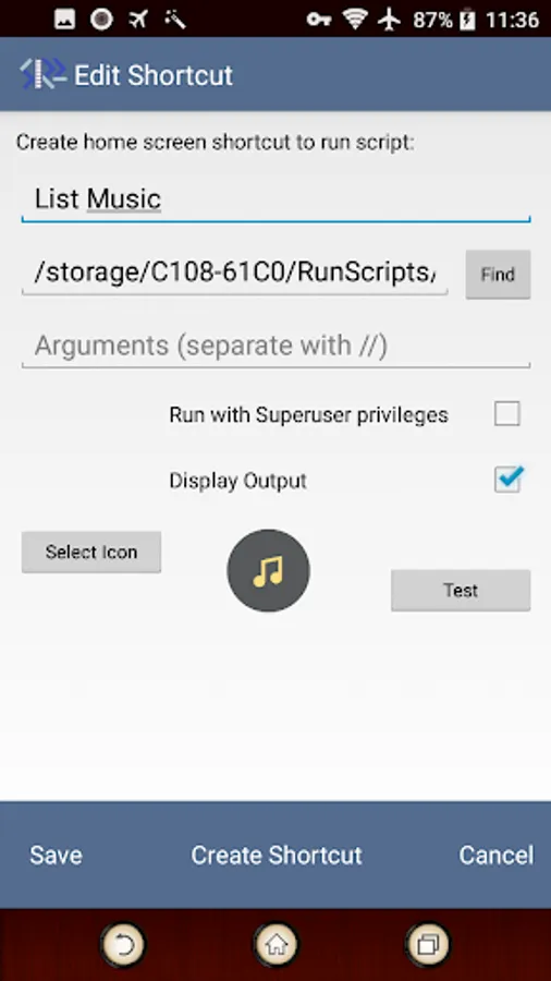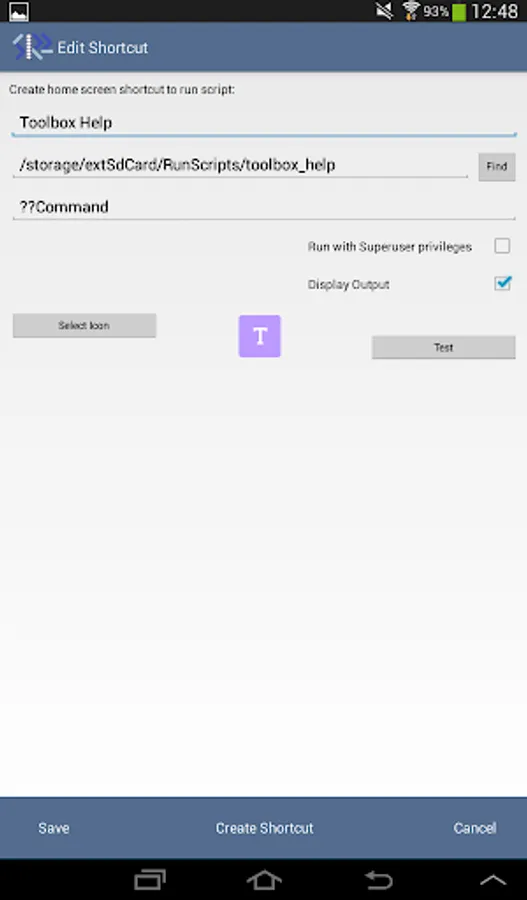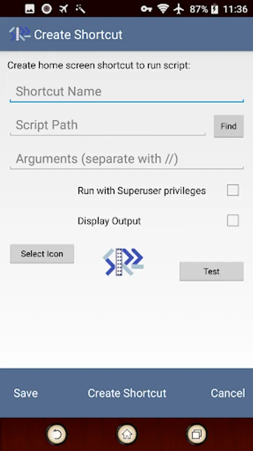 Script Runner 2 allows you to create home screen shortcuts that will execute your command scripts, prompting for arguments if required.