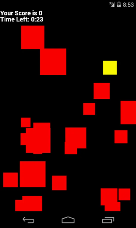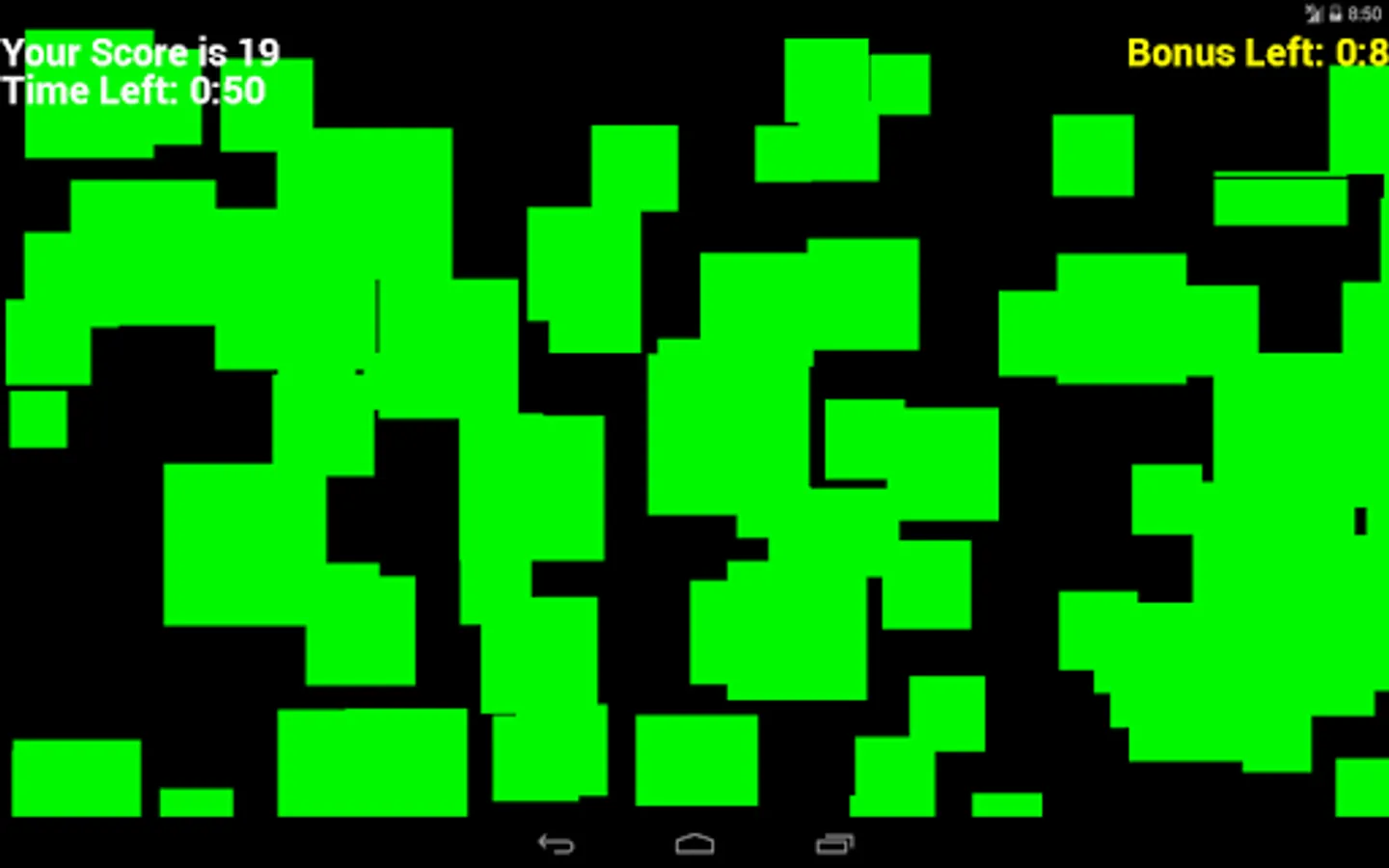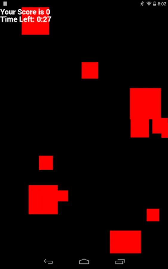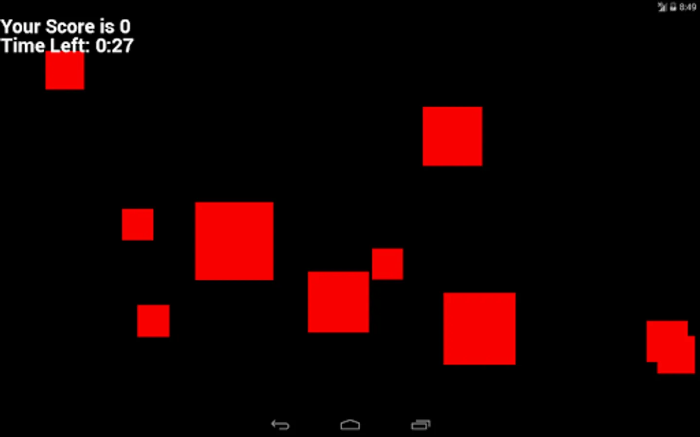 You have a certain amount of time to tap all of the red squares as fast as possible. Each red square is worth 1 point. Some squares are yellow instead of the normal red squares. These squares will give a certain amount of time of bonus. During this time, all squares will turn green and are worth 5 points. Also, the squares will spawn more often. If you tap and don't hit any squares, you lose 5 points.
