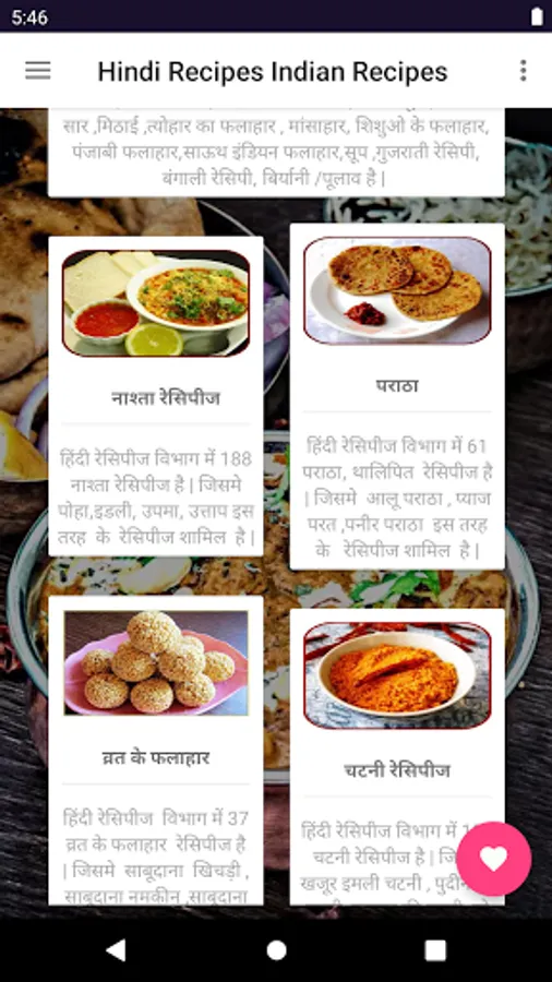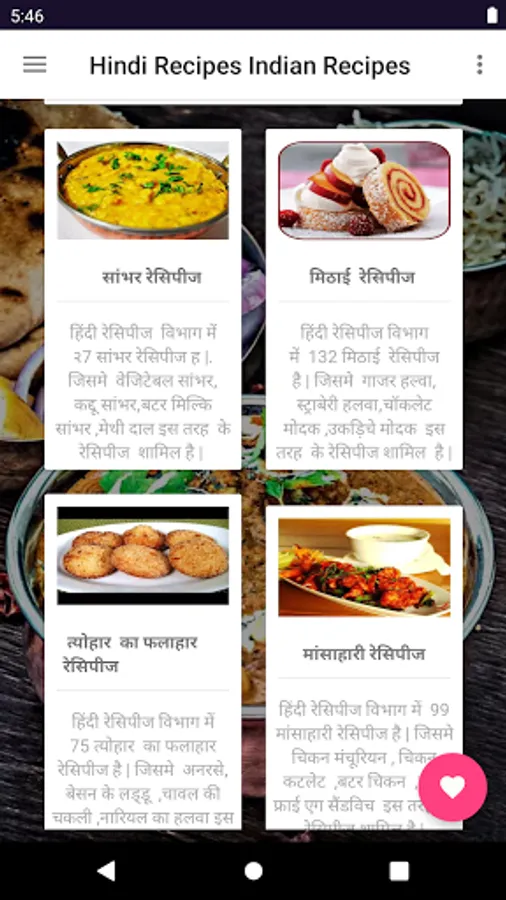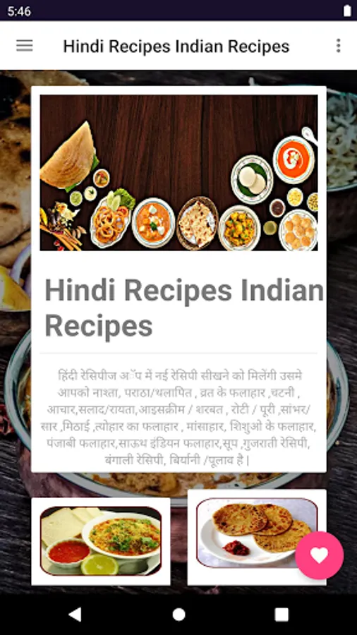 Hindi Recipes Application Contains tasty Indian recipes in the Hindi language. This app Indian dishes collection of Hindi recipe in a single app and provide various recipe methods and Items needed for recipe in the Hindi language. The app has many good features - like works in offline mode, the recipes can be easily bookmarked by using the favorite option, multiple sharing options, facility to search a particular recipe from all recipe tasty vegetarian recipes tasty nonvegetarian.