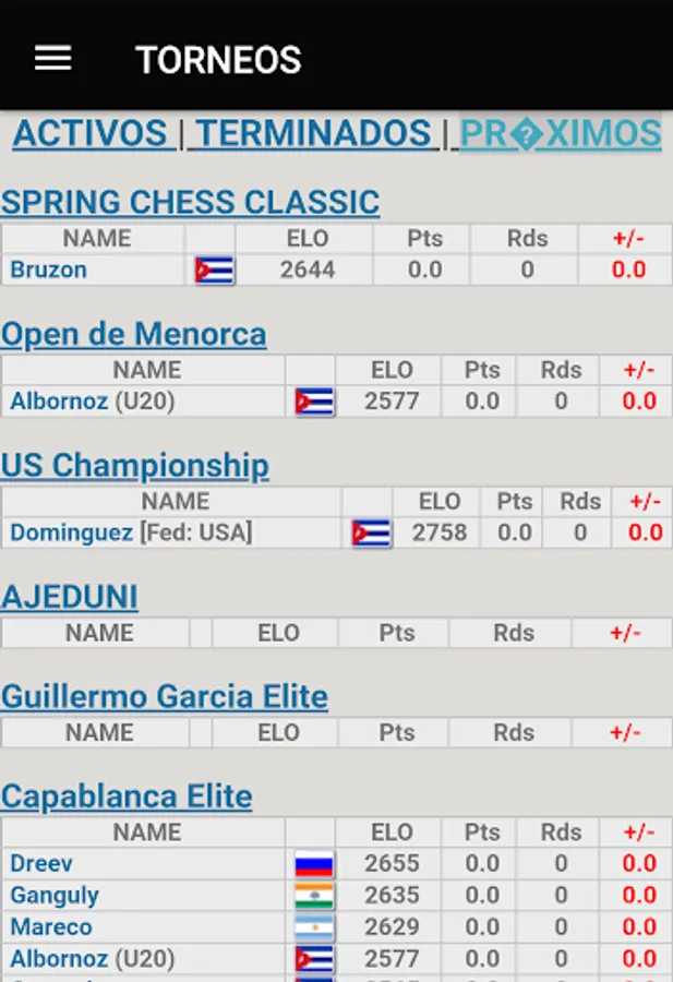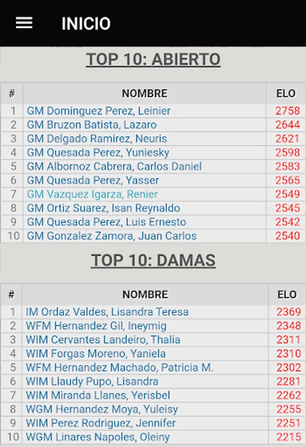 Tournaments, Live Ranking and News about chess and Cuban chess players. It also includes an ELO calculator. Using the information stored in www.ajedrezcuba.com