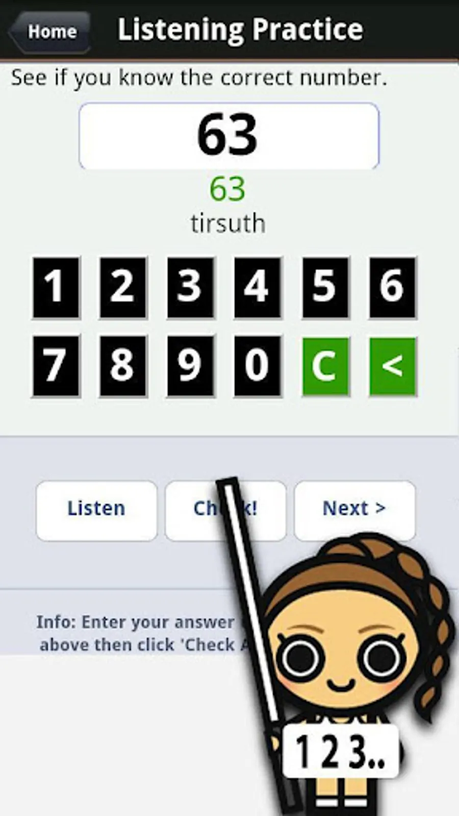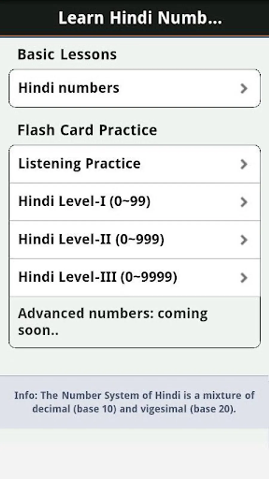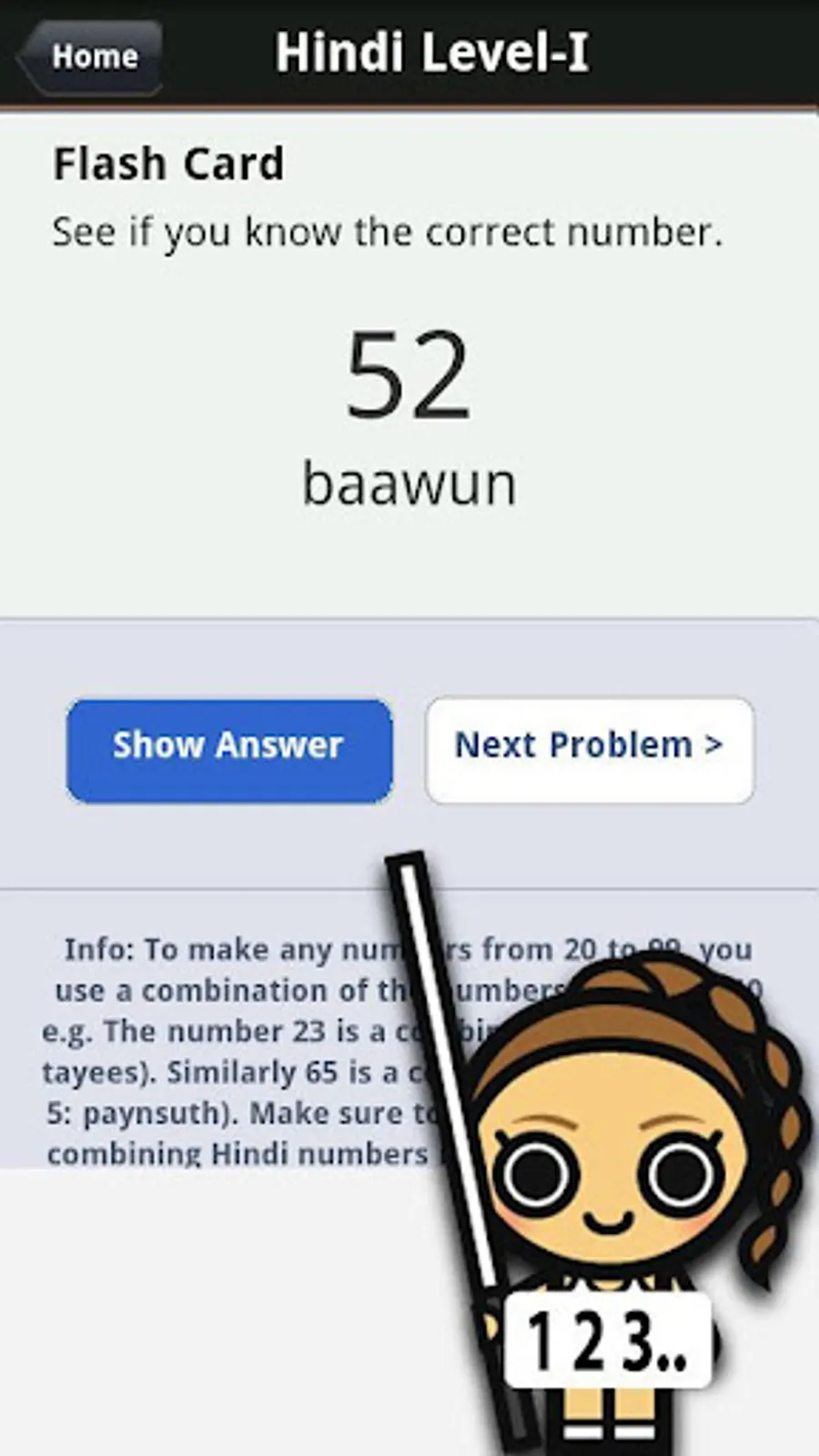 • Learn Hindi Numbers Fast: Is a great tool, on the go reference and study guide for learning Hindi numbers. Provides full Hindi audio pronunciation and a mini game to help you improve your Hindi number skills quickly. Go out shopping and buy things with ease on your next visit to India! Hindi Counting, Numbers and Numerals with Audio pronunciation for trips to India, New Delhi, Bangalore, Mumbai, Bombay, Jaipur, Udaipur, Gurgaon, Kolkata, Calcutta, Agra, Kochi, Cochin, Goa, Jaisalmer, Rishikesh, Chennai, Madras, Hyderabad, Varkala, Pune, Jodhpur, Manali, Shimla, Ahmedabad, Visakhapatnam, Tirunelveli, Haridwar, Pondicherry and Thrissur.