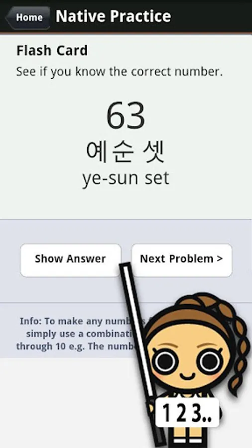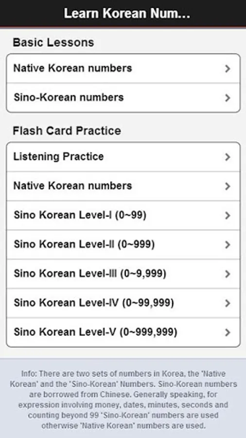 • Learn Korean Numbers Fast: Is a great tool, on the go reference and study guide for learning Korean numbers. Learn Korean Numbers provides full Korean audio pronunciation and a mini game to help you improve your Korean number skills quickly. Go out shopping and buy things with ease on your next visit to Korea! Features both Pure and Sino Korean numbers.