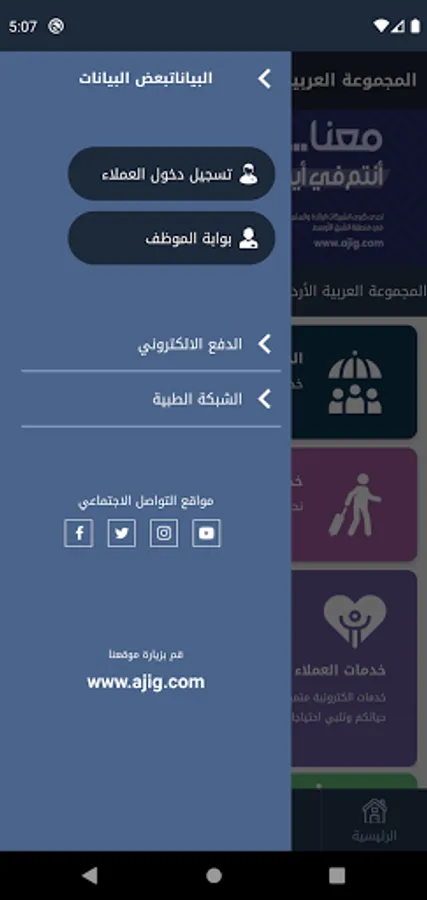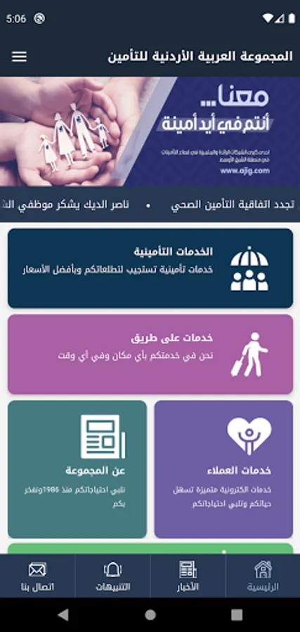 تطبيق المجموعة العربية الاردنية للتأمين بنسخته الأولى والذي يوفر لكم معلومات عن مختلف أنواع الخدمات التأمينية التي نقدمها لكم مع امكانية تقديم طلب تأمين من خلال التطبيق