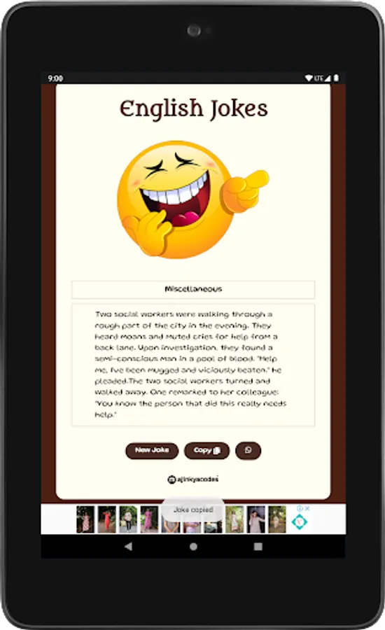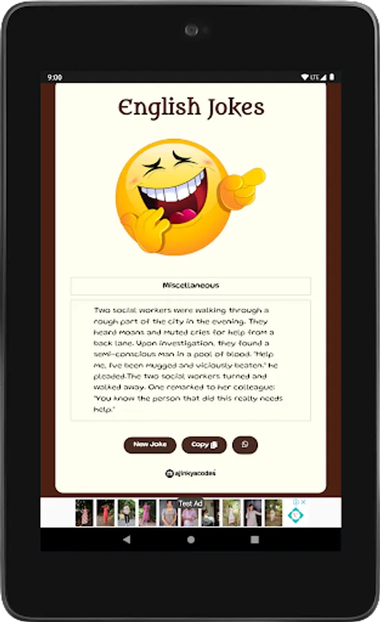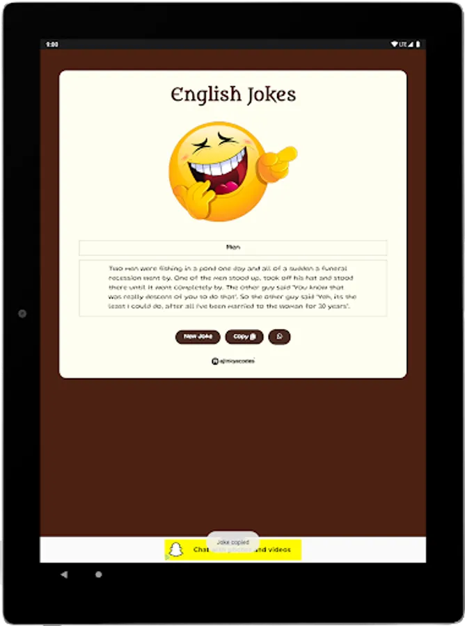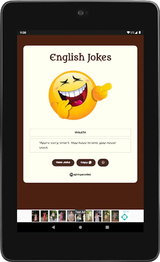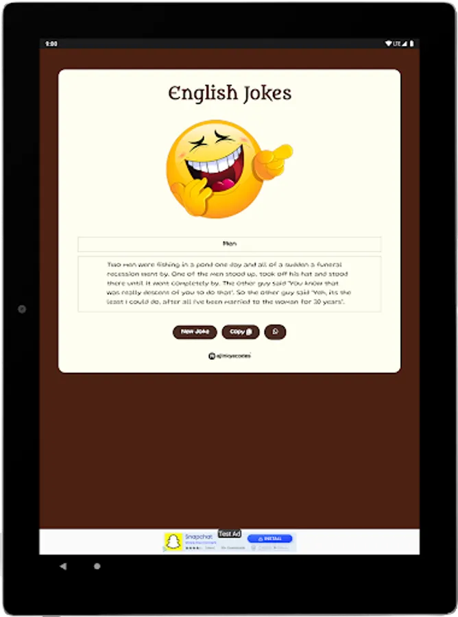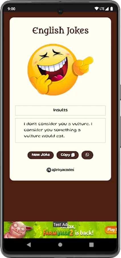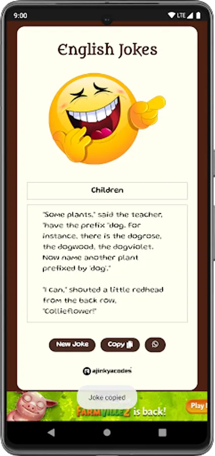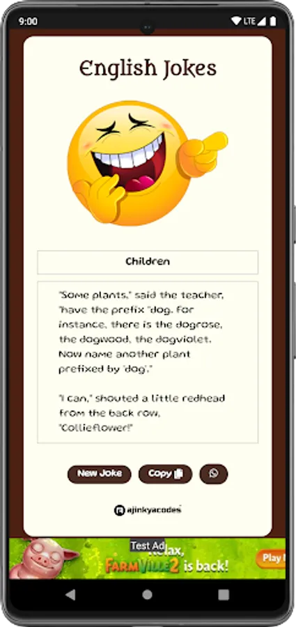 English Jokes app displays random jokes with different categories. You can click on the new button to load another joke. Every time you will get a different random joke. You can click on the copy button to copy the joke text. You can click on the WhatsApp icon to share the joke directly on WhatsApp with your contacts.
