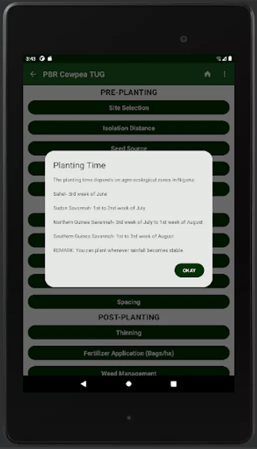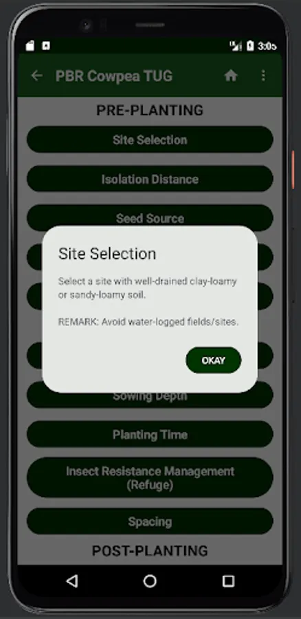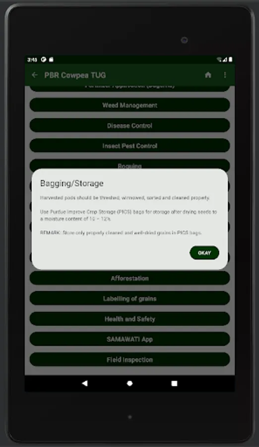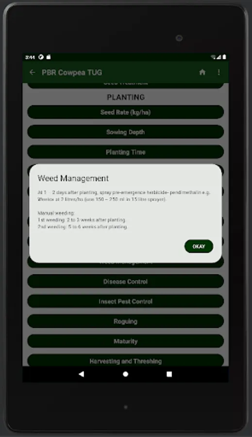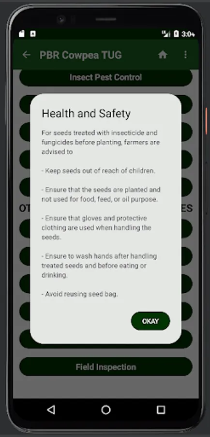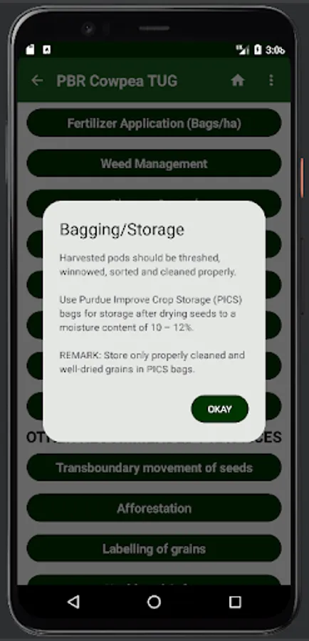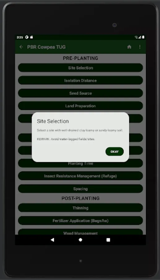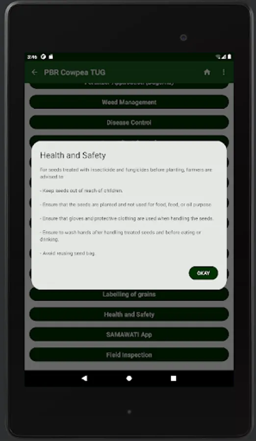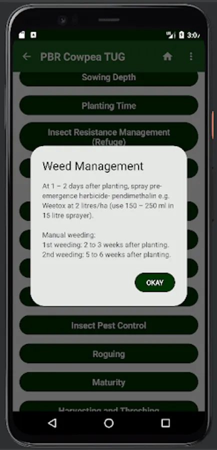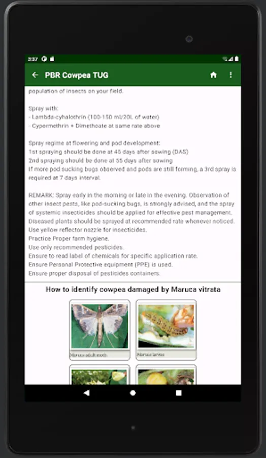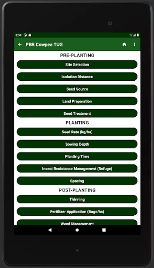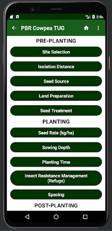 This mobile app was built to enhance access of seed producers, agricultural extension agents, and farmers, to information on the recommended practices for the production of Pod Borer-Resistant (PBR) cowpea seeds and grains.