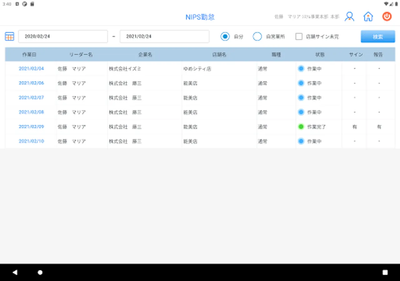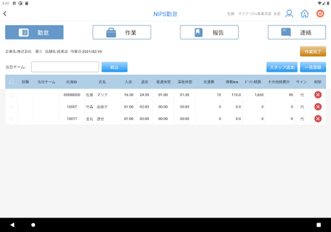 The main functions are store work status management, individual attendance management of workers, expense management, report registration and internal contact confirmation. We offer a concise screen, refreshing colors, convenient operation, and a great experience.