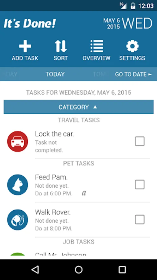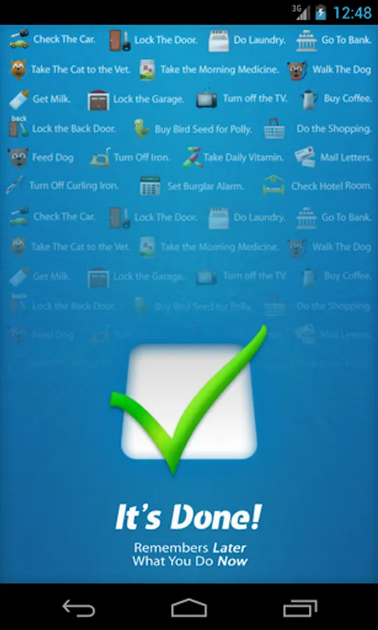 Unlike calendar and task apps that nag you to do things, It’s Done simply confirms completion of routine tasks. After all, most people don’t need a reminder to lock the door. The problem is recalling later whether or not you actually did it. Everyone knows that feeling! It’s Done solves the problem and eliminates that feeling of uncertainty.