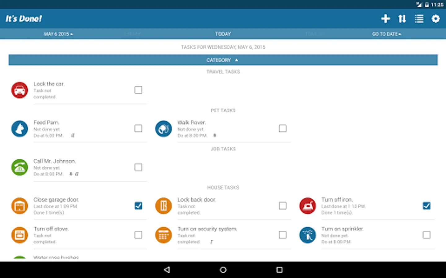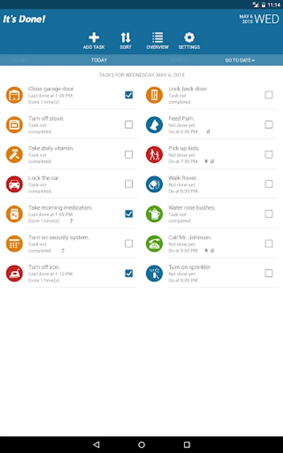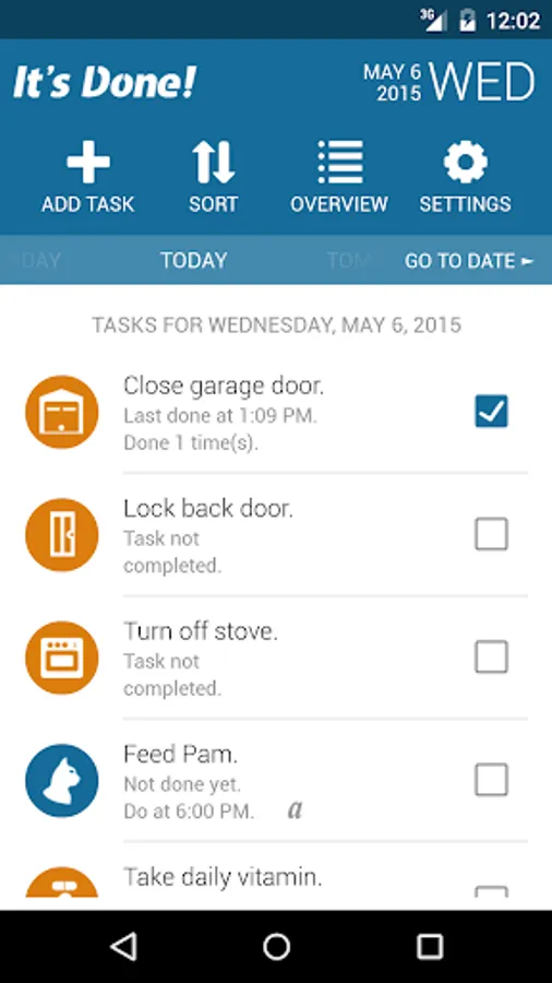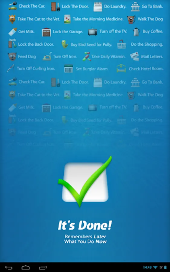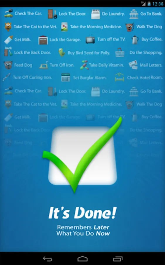 It's Done is better than complicated calendar or task apps, It’s a quick and easy tool for helping you instantly recall every routine task you performed earlier. Finally, you can complete your task list and relax after you leave home knowing It's Done!