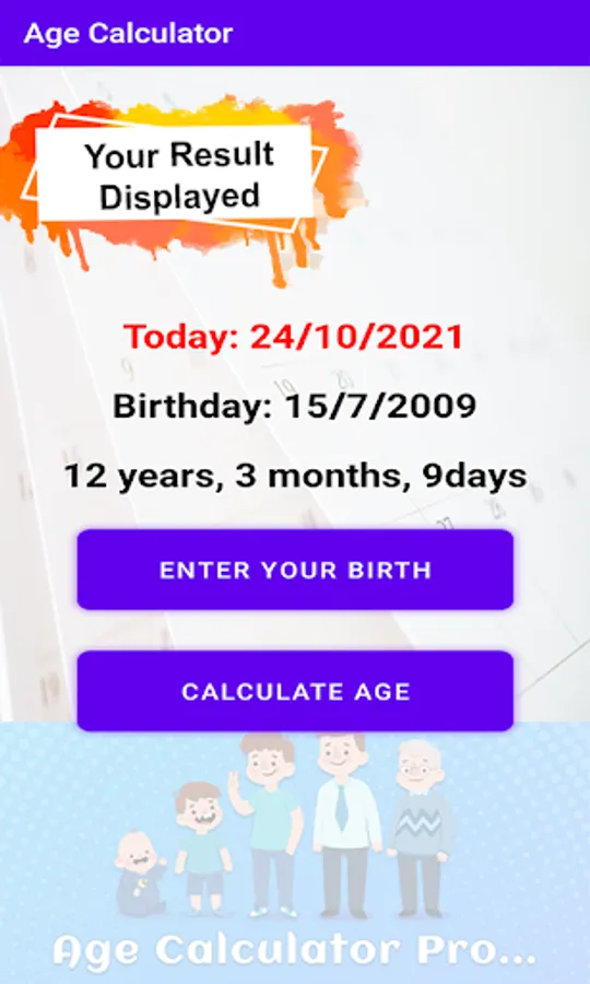 • Here in this Age Calculator App, You have to just insert a Date of birth and Age Calculator will calculate age in Year Month & Days.