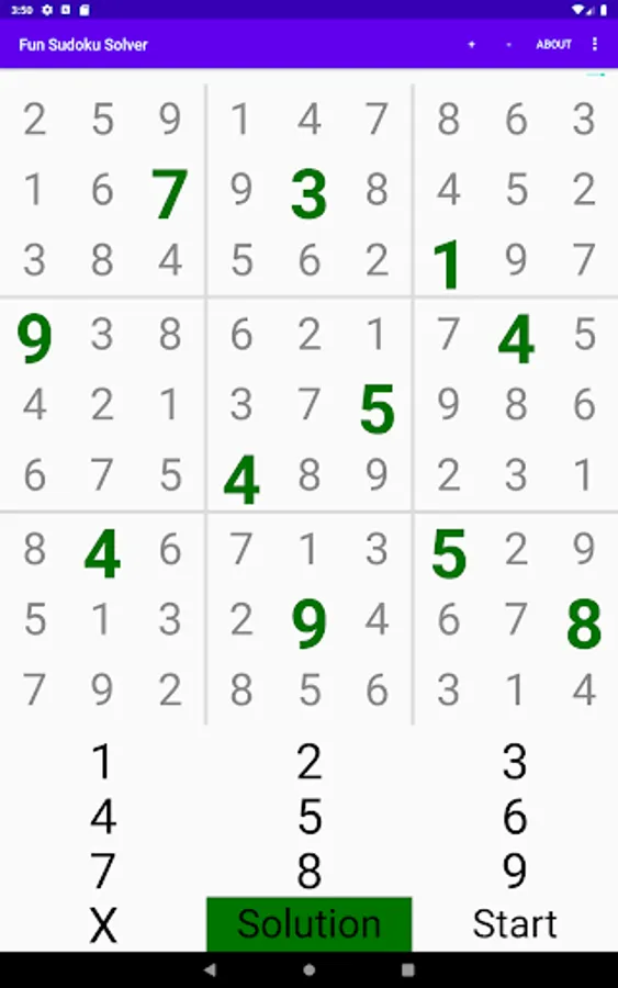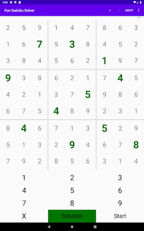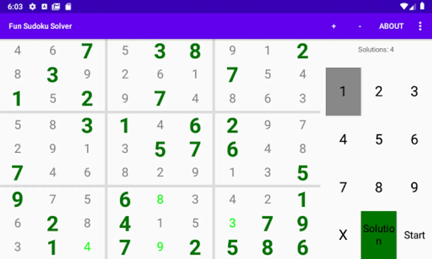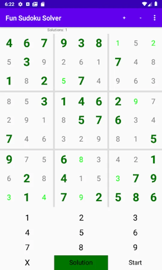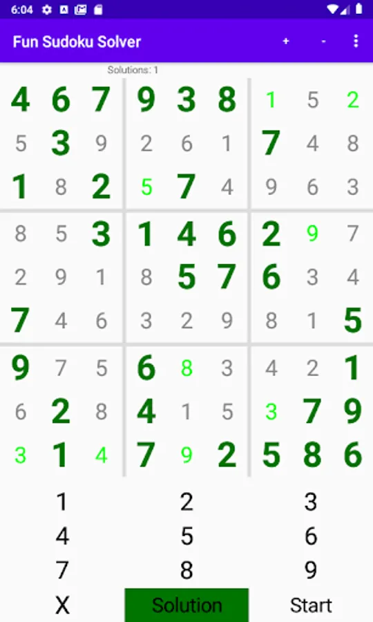 This app will solve Sudokus for you. It also helps you to create Sudokus. A real Sudoku should have exactly one solution. Directly after entering a number, you can see a solution and the number of solutions. You can choose if you want to see immediately see the solution, or to see the app solving it.