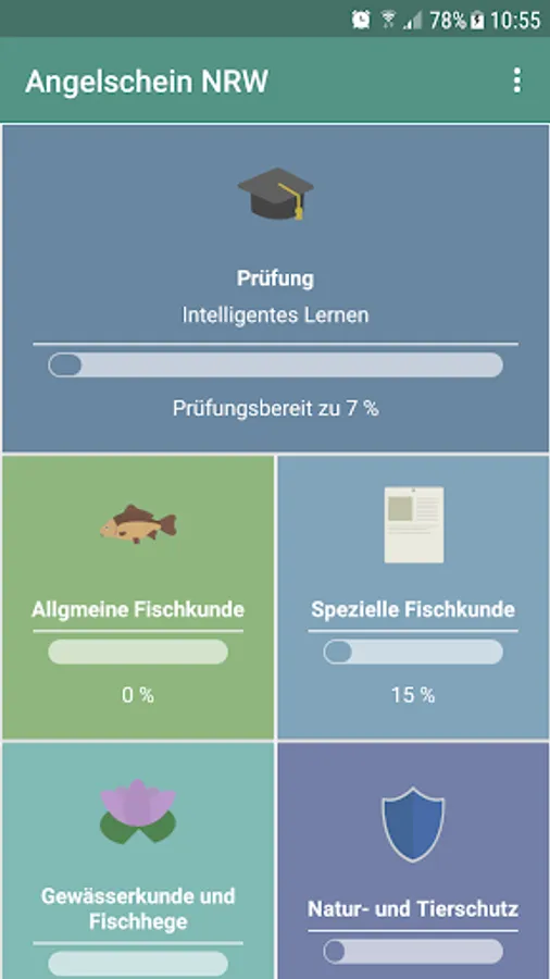 With this app, you prepare yourself perfectly for the Fischerprüfung in North Rhine-Westphalia! Filled with the original exam questions (as of 01.01.2015), you have the opportunity to practice the topics individually or leave the app, with its intelligent learning system, to pick the questions that are hardest for you!
