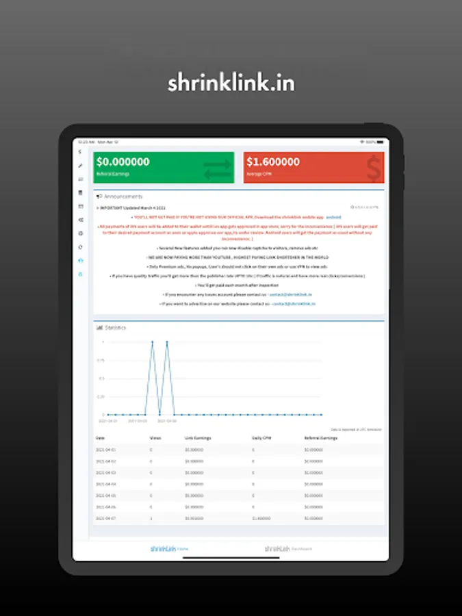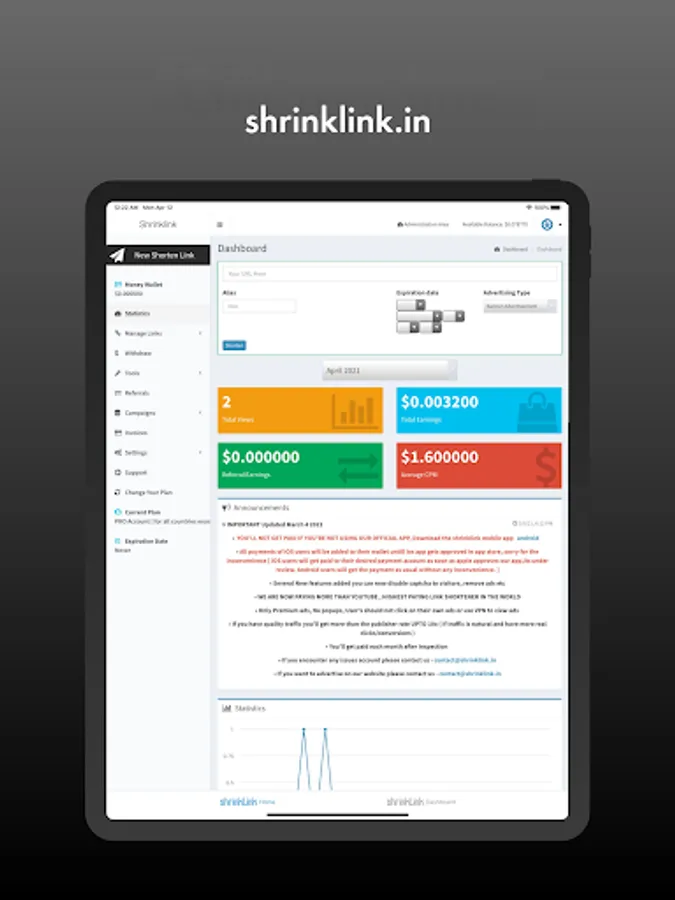 shrinklink pro gives you an uninterrupted app experience without ads. Shrinklink is the world's highest paying link shortener. Shrinklink also comes with an advanced link tools that no other websites or link shorteners provide. Shrinklink only has high quality premium banner ads which does not contain any popups or irritating ads. Shrinklink gives you an opportunity to generate passive income, Links are one of the mostly used way to share and communicate and whenever you create or share a link don't forget to shrink it with shrinklink. If you have quality traffic you'll get paid more than regular publisher rate. shrinklink also has PRO or FAN features. Experiece shrinklink now.
