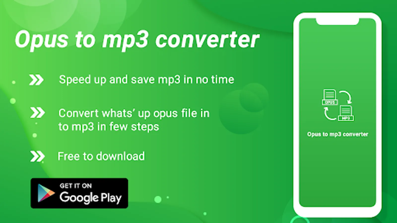 Opus to Mp3 Converter for WhatsApp Audio app converts Opus to Mp3 file. Opus to Mp3 Converter is easy and simple to use. Opus to Mp3 Converter for WhatsApp is totally offline app.
