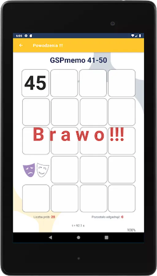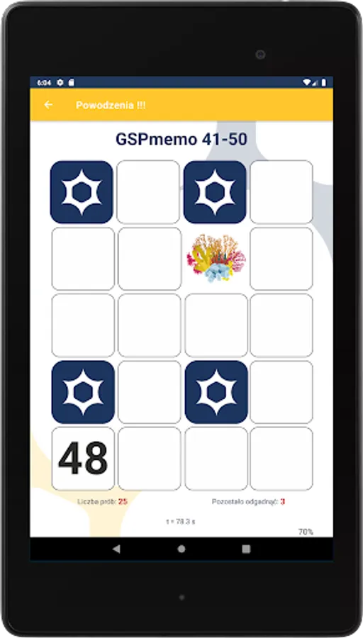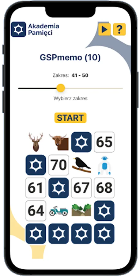 At the beginning, the user selects one of the 11 tens (1-10, 11-20,…, 91-100, 00-09). It also sets the guessing mode: from pictures to numbers / from numbers to pictures. When started, the timer starts and the first image / number is shown. If the user knows the image / number counterpart, he / she moves on. A randomly selected consecutive image / number is then displayed. If he does not know the answer, he can check what is the correct counterpart (CHECK button). After all the images in the range have been displayed, the timer stops and you can evaluate your results.